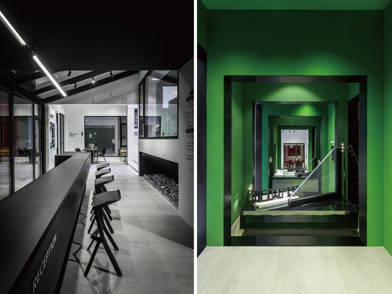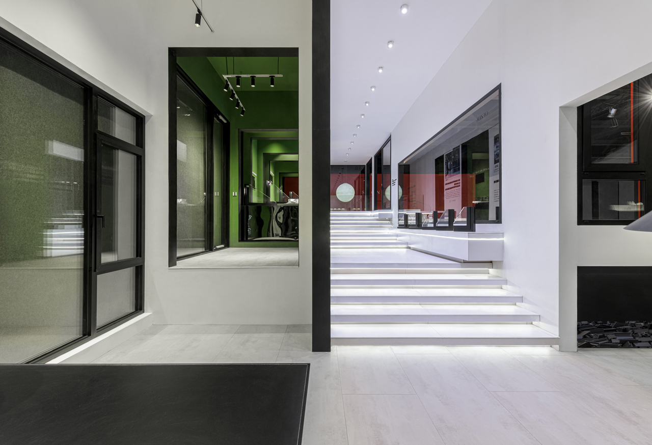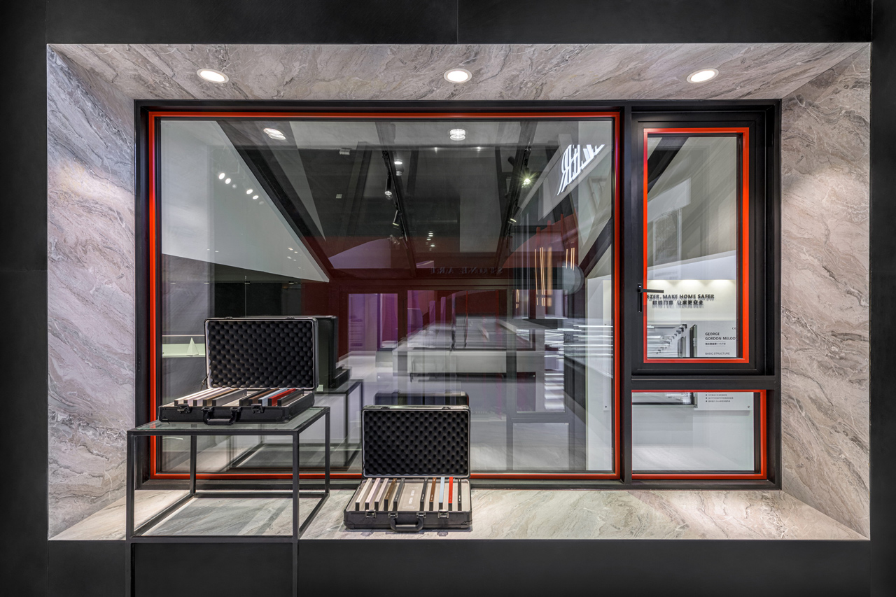 本次設計特別以「回顧展」的概念形式融合於展示中,以回顧過去兩年間品牌所參與的各項展會活動,強化策展與交流的特質。在2018年威尼斯建築雙年展,歐哲以free is more為概念,藉由模型展示未來空間形態的實踐,勾勒出建築發展的願景。同年在廣州設計周,我們透過大量階梯、平台營造高低錯落,多元的場景層次,藉由上下起伏的博物館遊逛路徑,創造豐富空間感知並模糊公共空間與動線之間的分際。2019年廣州建博會,我們以門窗發展史的軸線發想,透過柯比意、密斯.凡德羅等建築大師的經典設計元素,結合既有展場機能及活動融入斜向切割後的空間,藉此向大師致敬。從2018年的威尼斯到2019年的廣州,由門窗的自由到互動連結的解放,形構出多樣的空間變化,自由、多樣而流動的場域營造已成為歐哲展場的一貫特色。本次空間設計在融入這些精神之外,也特別透過在主動線坡道間以大紀事策展牆的表現手法,鉅細靡遺地記錄下來。
