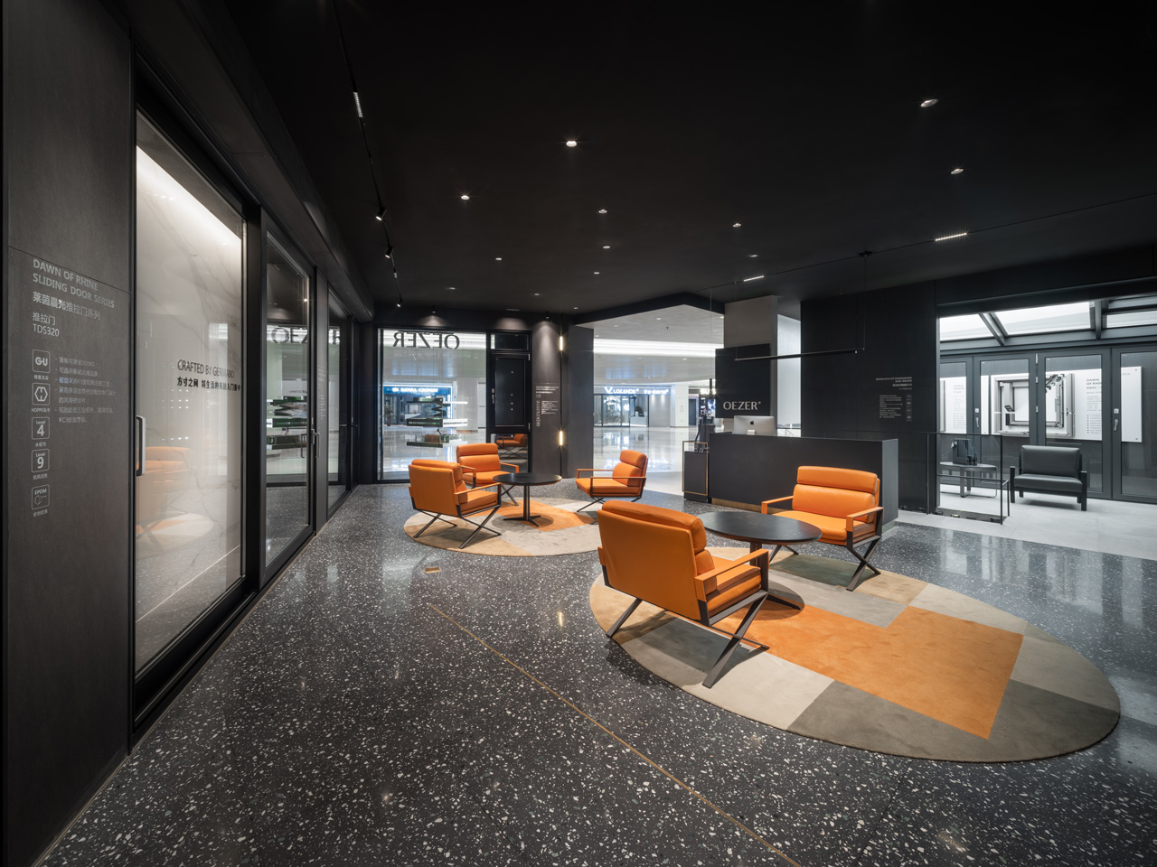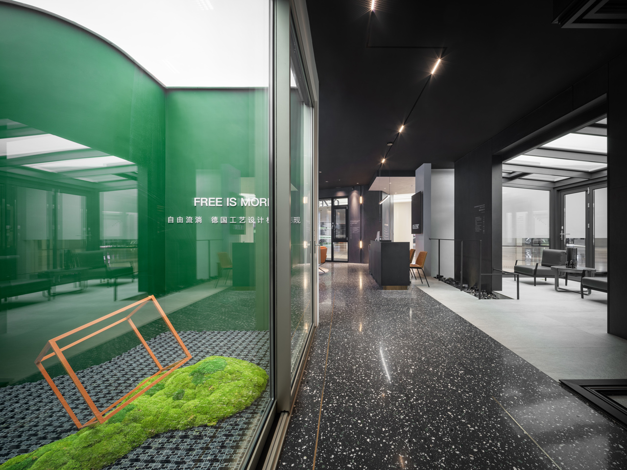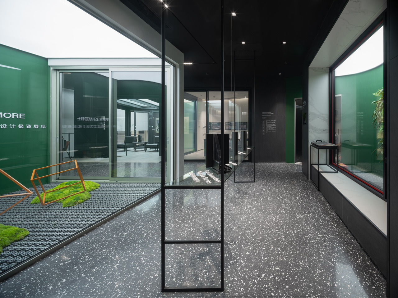 Within the rectangular building lot, the tricolors' tone of black, white, and gray integrated with terrazzo, metal plates, and stones to build their unique yet contemporary characteristic. The overall space was designed with a retreated tilted layout and fuzzy boundaries, breaking the existing framework, creating clear zoning, and strengthening the sense of transparency while increasing interactive opportunities. Finally, designers incorporated those window and door products into walls, spun the width limitation of the traditional showroom. The salon area complied with the tilted layout at the central position, surrounded by planting and blank spaces for events including gatherings and exhibitions. Such design thinking made space far beyond business mere function but look for the learning and communication among visitors. With those insights and open space planning, a retail store emphasizing interacting and sharing was born to promote the brand’s commercial spaces’ unique differentiation.