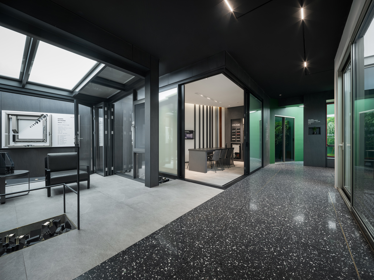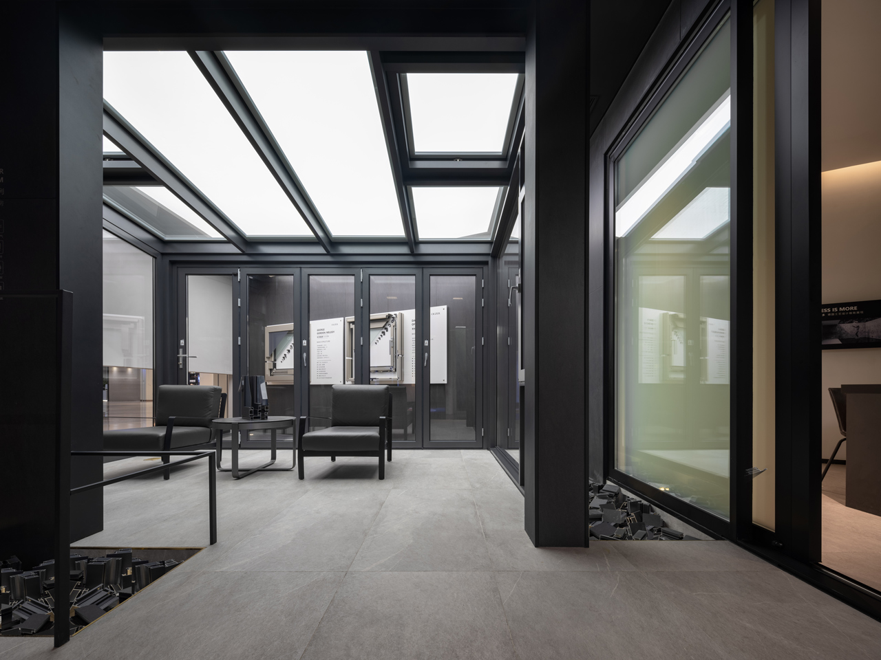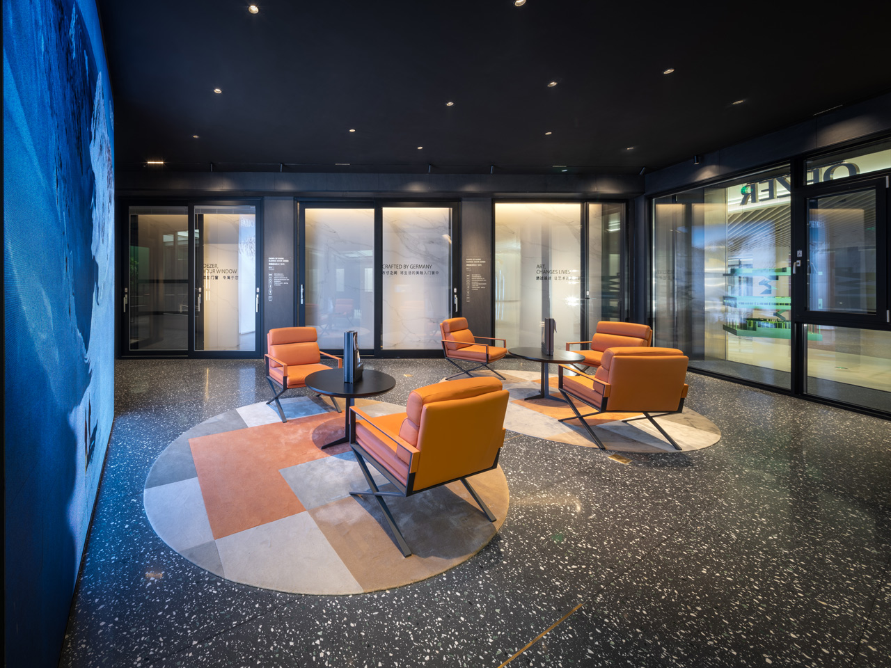 Within the rectangular building lot, the tricolors' tone of black, white, and gray integrated with terrazzo, metal plates, and stones to build their unique yet contemporary characteristic. The overall space was designed with a retreated tilted layout and fuzzy boundaries, breaking the existing framework, creating clear zoning, and strengthening the sense of transparency while increasing interactive opportunities. Finally, designers incorporated those window and door products into walls, spun the width limitation of the traditional showroom. The salon area complied with the tilted layout at the central position, surrounded by planting and blank spaces for events including gatherings and exhibitions. Such design thinking made space far beyond business mere function but look for the learning and communication among visitors. With those insights and open space planning, a retail store emphasizing interacting and sharing was born to promote the brand’s commercial spaces’ unique differentiation.