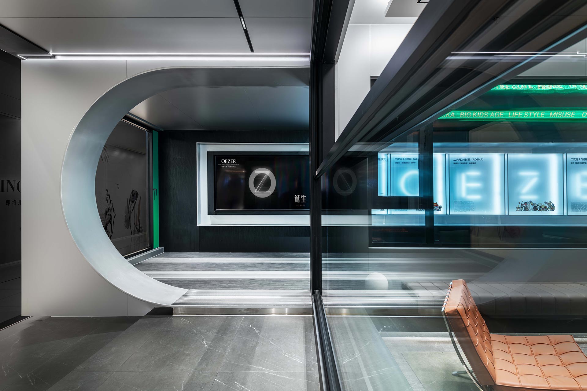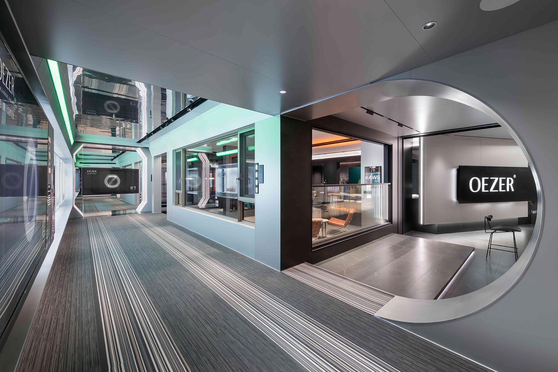 歐哲六代店設計,延續五代以斜向佈局及創想實驗室建構的多元趣味場景基礎,由前後兩大方盒量體框出的展售店空間中,分別呈現潮流藝術與工藝技術展示,包含潮文化策展藝廊(POP LAB)、開放式社交活動沙龍、生活場景力樣板角落、創新研發廊(OEZER LAB)等四種空間形態,並在主題式設定的展區內植入不同系列的門窗產品。