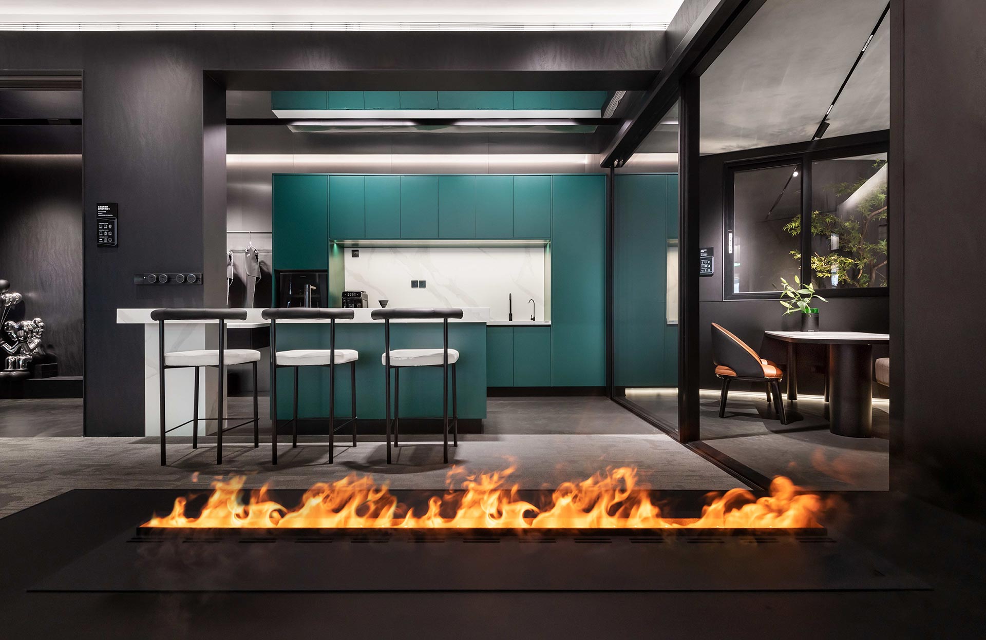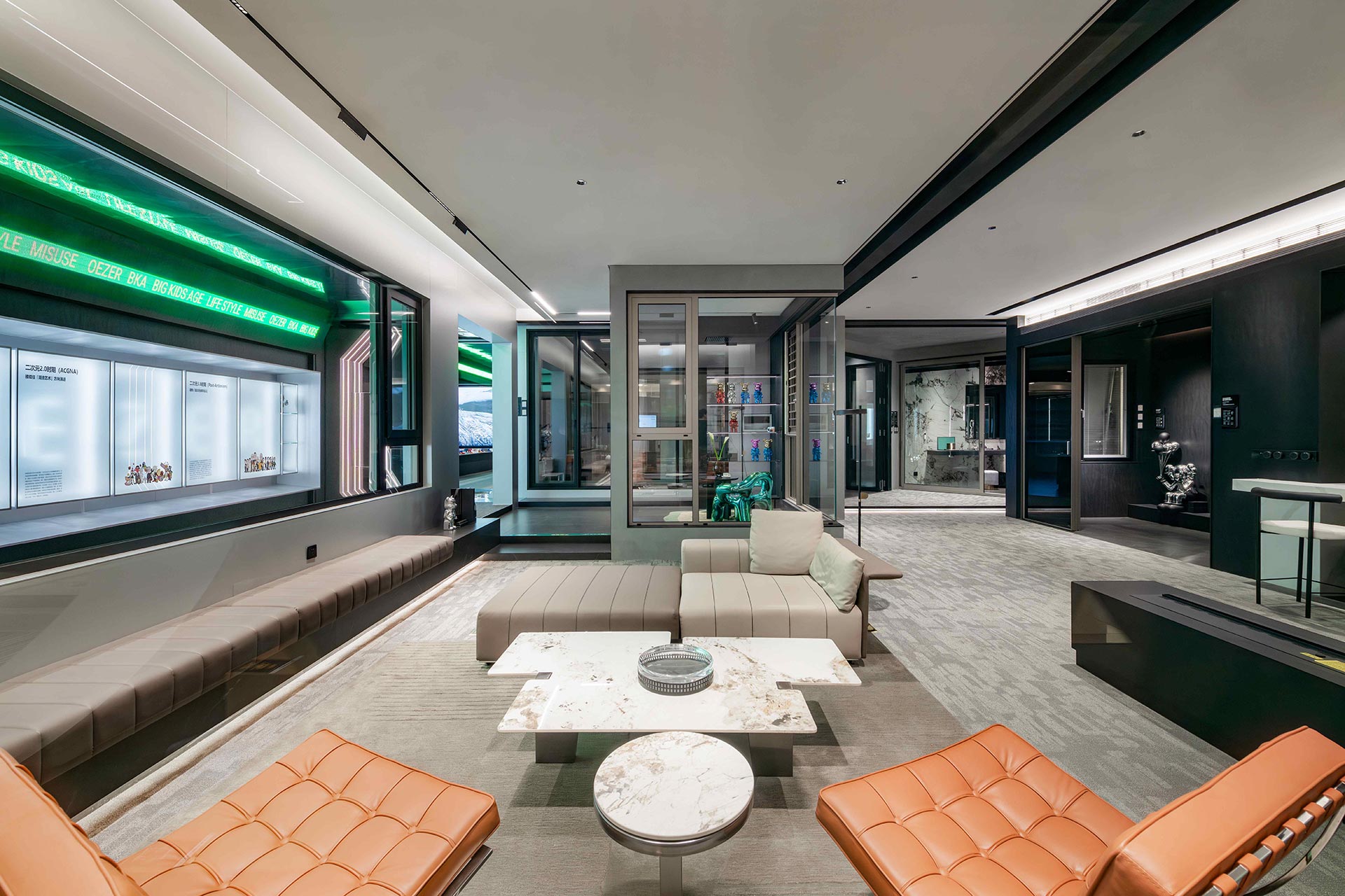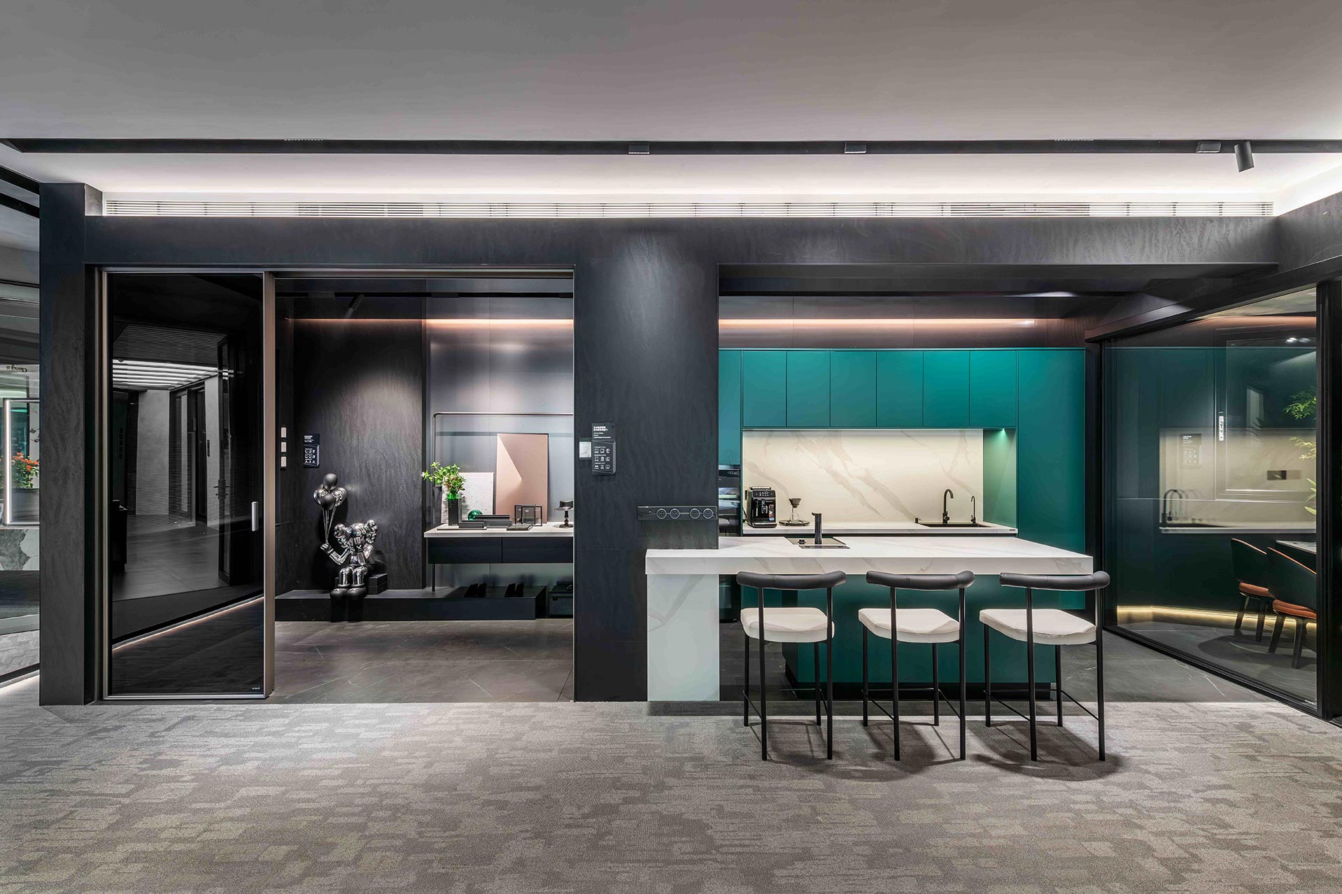 六代門店以「兩廊一院」為概念操作的空間佈局,由品牌長期強調的安全性訴求出發,在前場部分包含前述感性的潮文化策展藝廊,以及廊道圍塑出的活動沙龍、開放式大家居客廳與集合餐廚區。餐廚區尾端以一個轉向進入後場部分,這裡以理性的工藝技術展現為重點,展區正中央的技術島台作為核心,圍繞著茶藝室與設計師交流區,期許透過技術性的深化連結品牌、消費者與設計師三者。在空間轉向之下,場域之間形成的畸零L角被設定為回應生活的場景角落,透過化妝間、衛衣間、品茗區等情境場域,結合潮流文化元素的主題,讓消費者將產品帶入真實生活的想像。兩廊一院的佈局概念,藉由理性與感性的交織鋪陳延伸出生活場景的建構,也回應了「讓家更安全」的企業訴求。