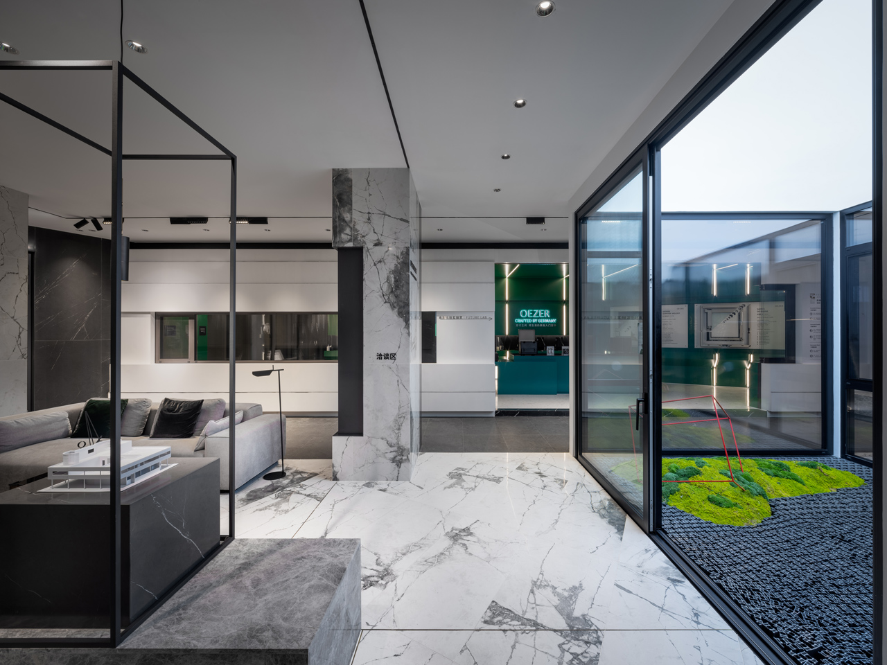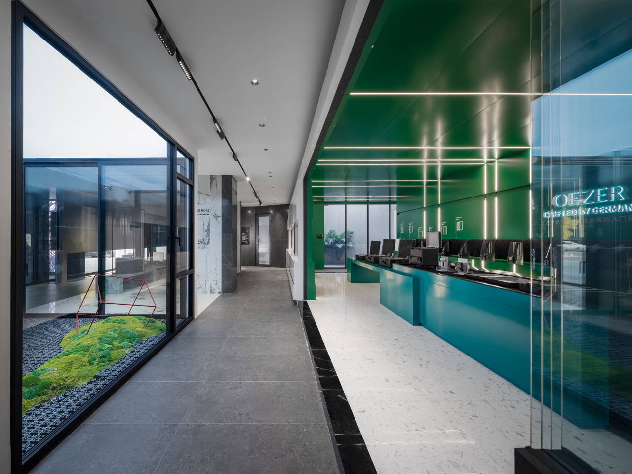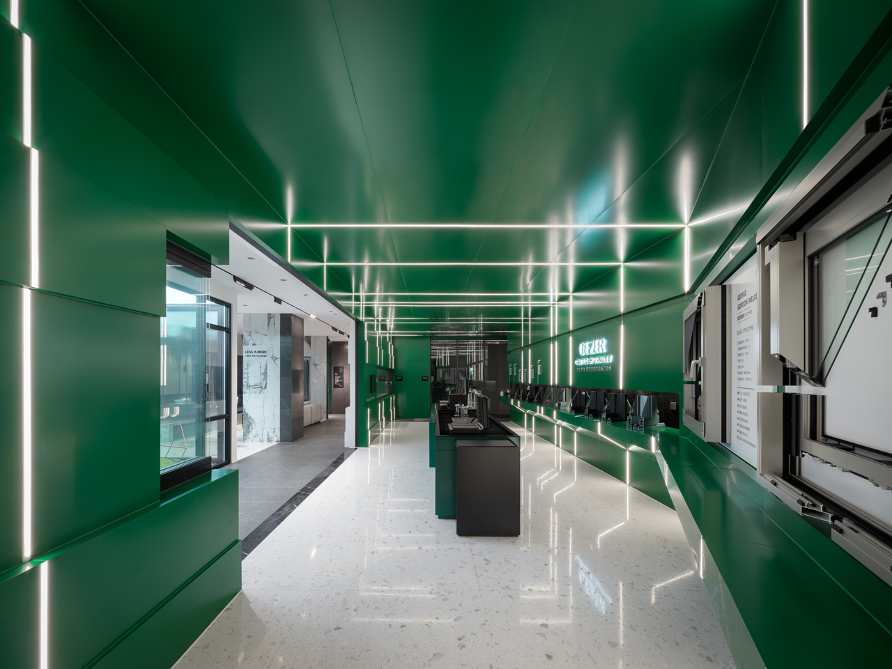 展廳空間的入口處結合斜向佈局以退縮手法設計,擴大玄關營造的空間意象,讓三角形平面營造出獨特形象與高端的迎賓氛圍。室內有別於傳統以硬隔間區隔的商業空間,改以開放通透的設計手法,在室內植入展示之外的社交體驗,藉由開放式的空間分割,創造彈性、多樣化的空間介面,加上不同機能的設定使用,為展廳創造出可供休憩、交流、互動的社交角落。此外,展廳內與外的中介空間也巧妙地應用超寬幅落地門窗產品,將室外景觀延伸入室內,創造模糊內外邊界的視覺情境。立面設計則結合歐哲企業主色-永續綠與鋁合金灰,以灰黑色調、呈現豎向分割的鋼結構,及綠色金屬張力網面材,營造出嶄新、一致性的品牌視覺形象。
