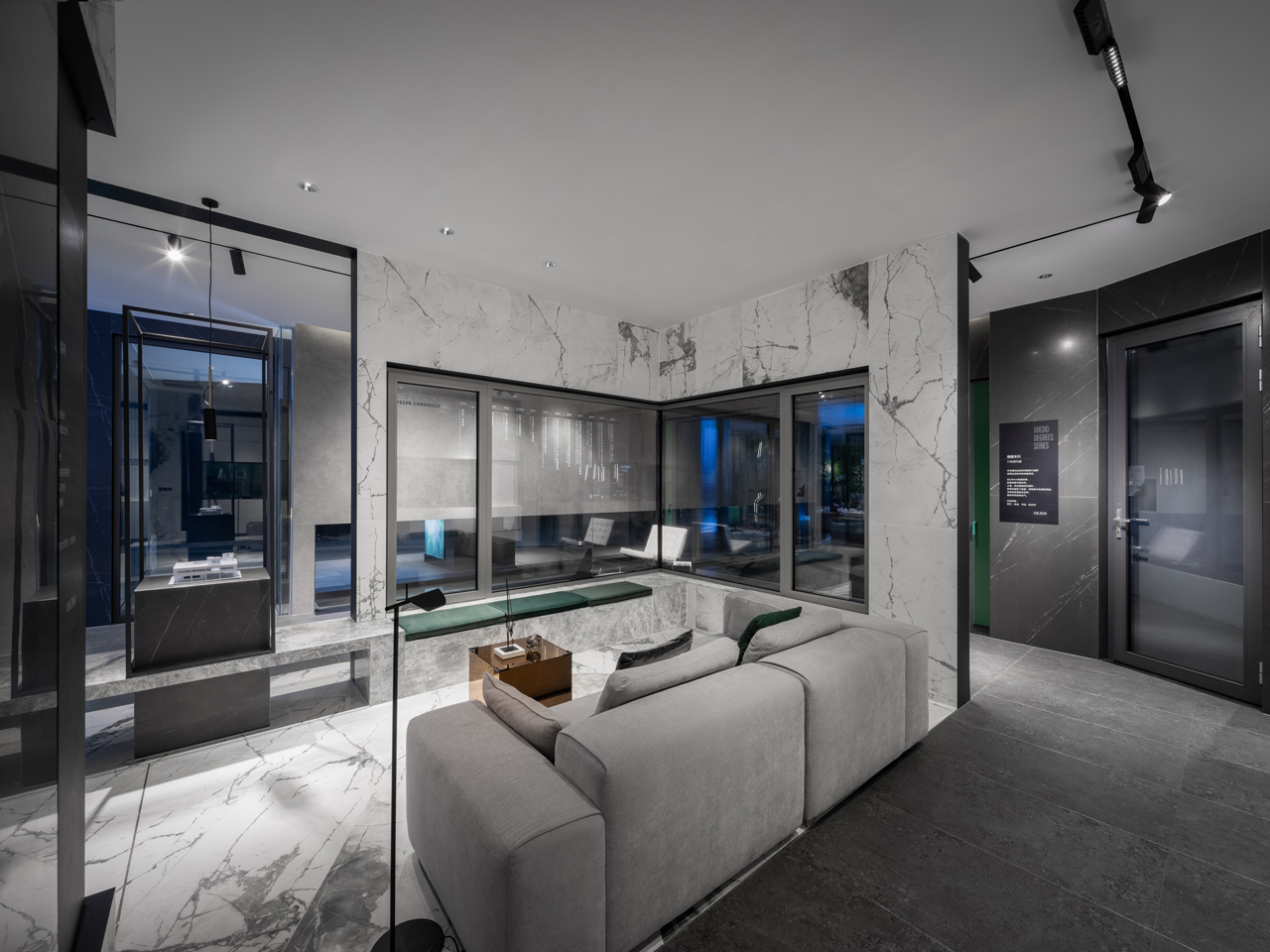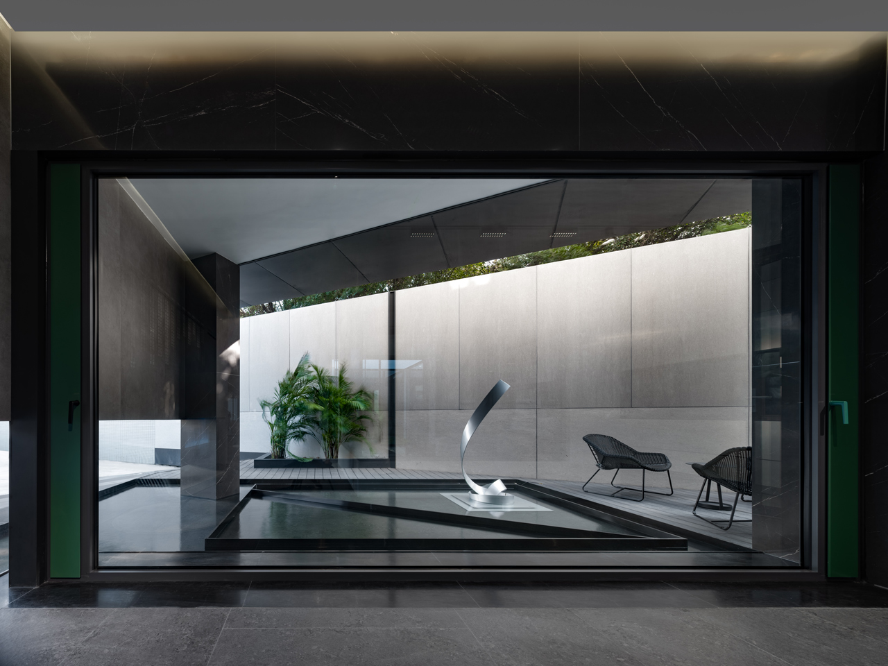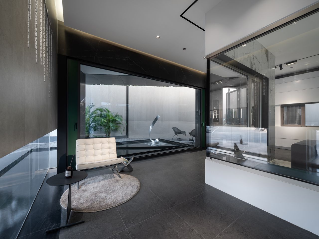 展廳空間的入口處結合斜向佈局以退縮手法設計,擴大玄關營造的空間意象,讓三角形平面營造出獨特形象與高端的迎賓氛圍。室內有別於傳統以硬隔間區隔的商業空間,改以開放通透的設計手法,在室內植入展示之外的社交體驗,藉由開放式的空間分割,創造彈性、多樣化的空間介面,加上不同機能的設定使用,為展廳創造出可供休憩、交流、互動的社交角落。此外,展廳內與外的中介空間也巧妙地應用超寬幅落地門窗產品,將室外景觀延伸入室內,創造模糊內外邊界的視覺情境。立面設計則結合歐哲企業主色-永續綠與鋁合金灰,以灰黑色調、呈現豎向分割的鋼結構,及綠色金屬張力網面材,營造出嶄新、一致性的品牌視覺形象。
