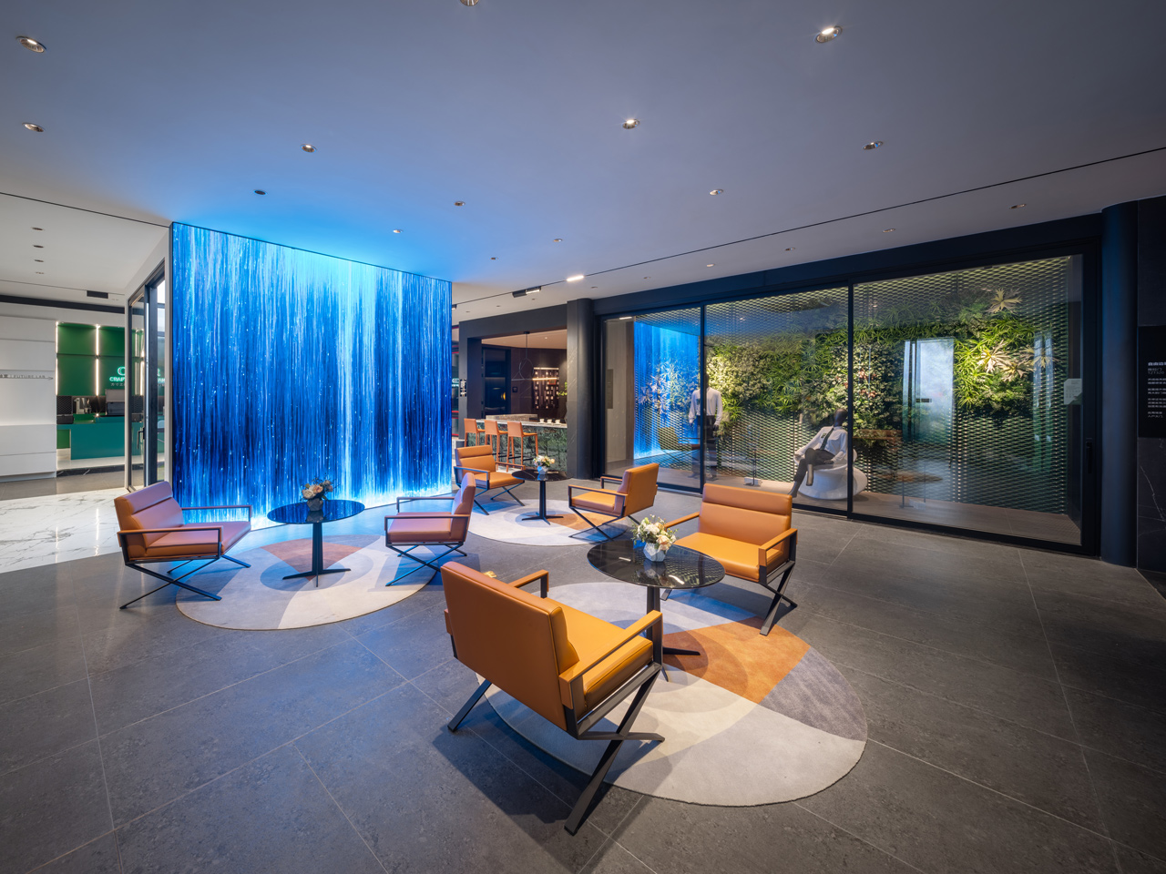 By combining a tilted layout and retreated border, the triangular entrance area of the building was enlarged to create a unique yet high-end atmosphere. Meanwhile, the interior space implanted social experiences besides the function of product displaying, differentiating it from the traditional commercial space with wall partition, also created a more flexible and diverse spatial boundary.