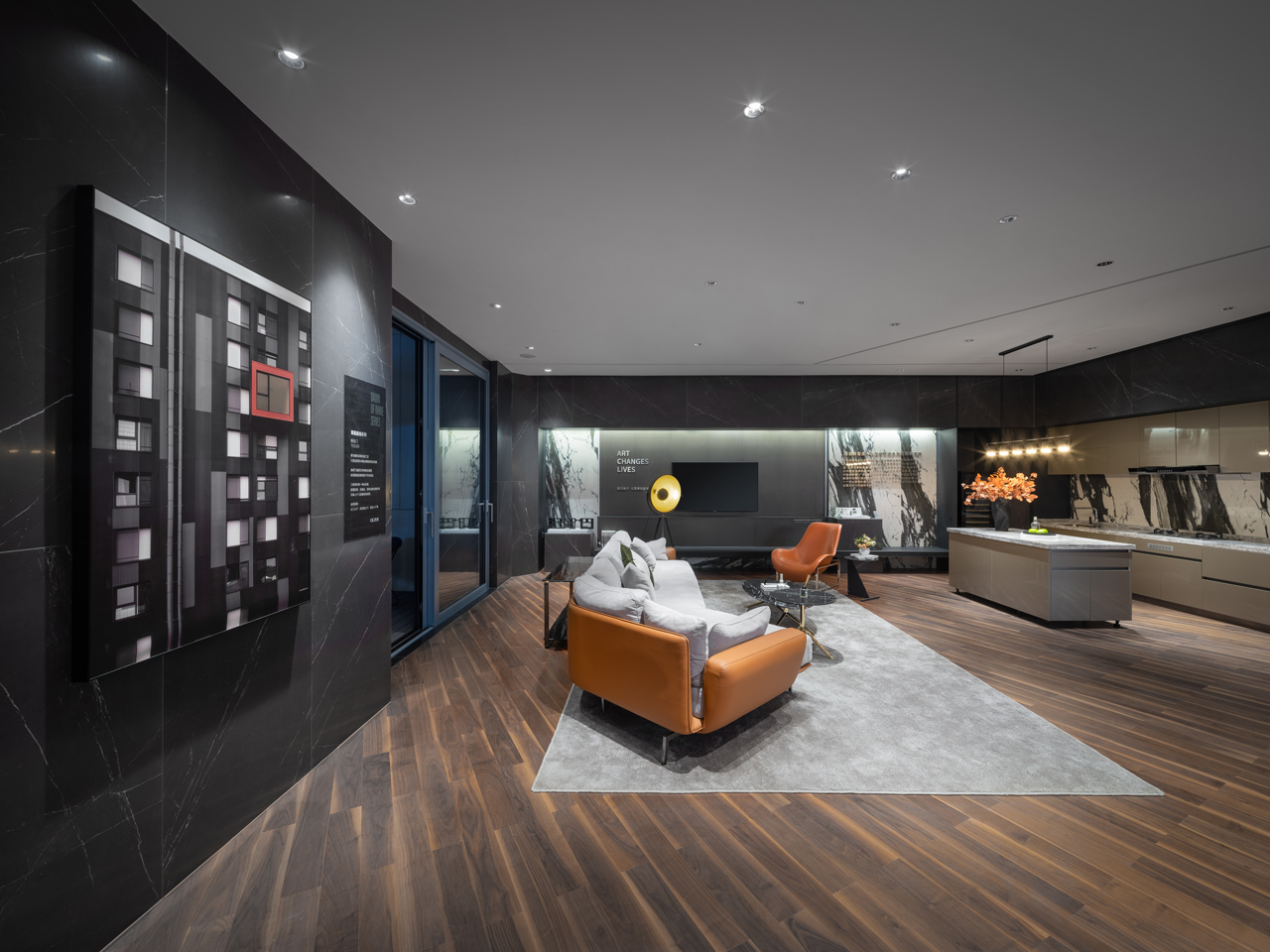 To further enhance the quality of the exhibition hall, our team horizontally rotated the entire grid layout to a tilted state, which had successfully improved the efficiency of space usage and created several blank corners as unanticipated social spaces, perfectly reflects OEZER's understanding of design and creation. In the center of the headquarters, an experimental space—LAB, was set up to bring knowledge into people's lives. The appearance of a spaceship descent from the sky represented the company's mission and intention on material development, user research, product upgrading, and safety improvement.