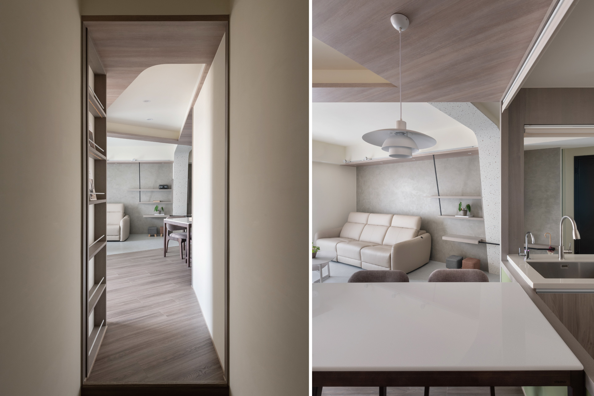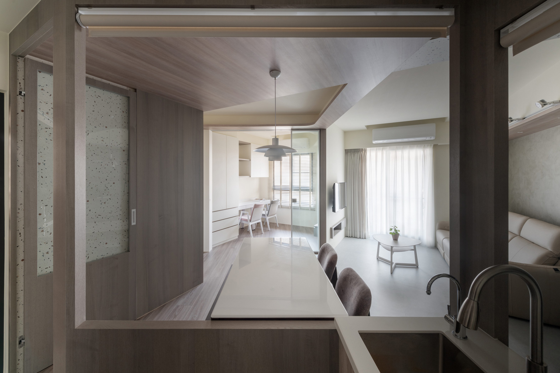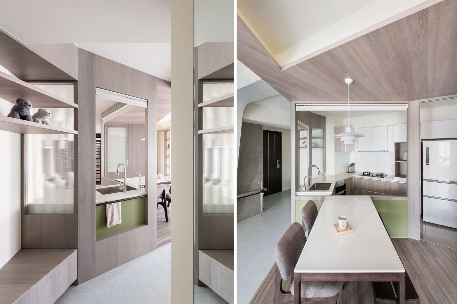 踏入玄關,兩道連續斜切牆面圍塑出的門廳空間,為「家」勾勒出明確的方向指引。在斜切面與結構柱之間的畸零區域置入外出衣帽櫃、穿鞋區等機能,並以木質家具結合對側牆上的全身鏡面,溫潤的居家質感,也讓室內產生放大的視覺效果。門廳後第二道斜向牆面設置可雙向使用的水槽,便於後疫情時代的居家衛生清潔。此一牆面同時順應公共區域的方位轉向,轉向部分為餐廚區域與多功能空間,全區採開放式規劃,並以架木高地板和客廳、玄關做出場域分界,創造流動的空間感受。以玻璃推拉門形式設計的多功能空間則成為公私領域混合的模糊邊界,一方面因應不同的使用狀態彈性調整,也便於孩子長大後的空間需求調整預作準備。