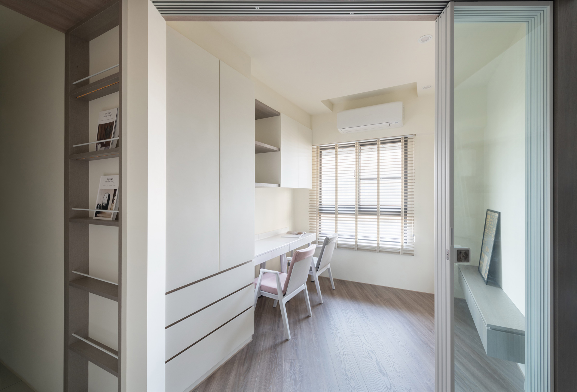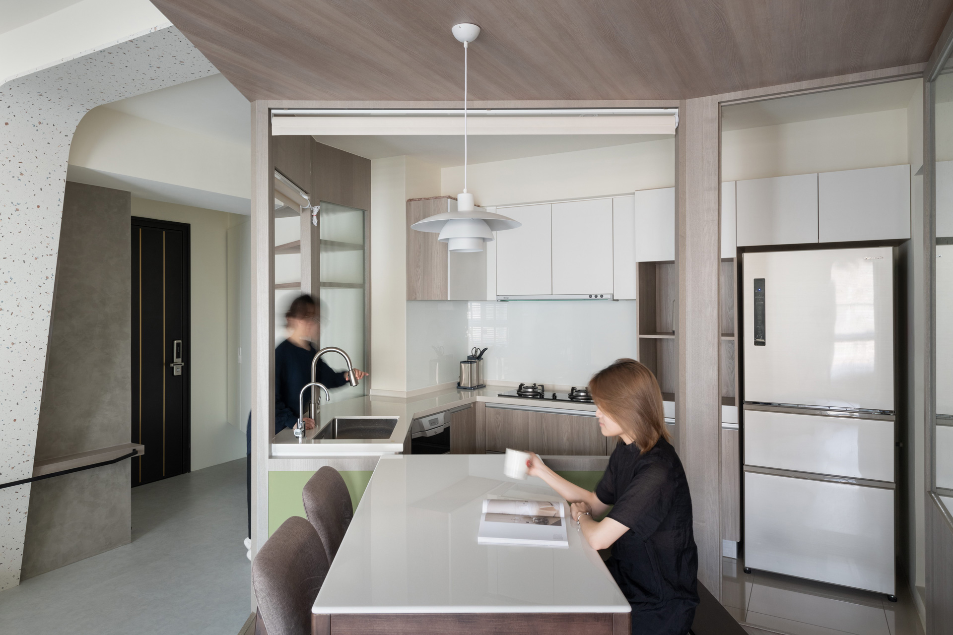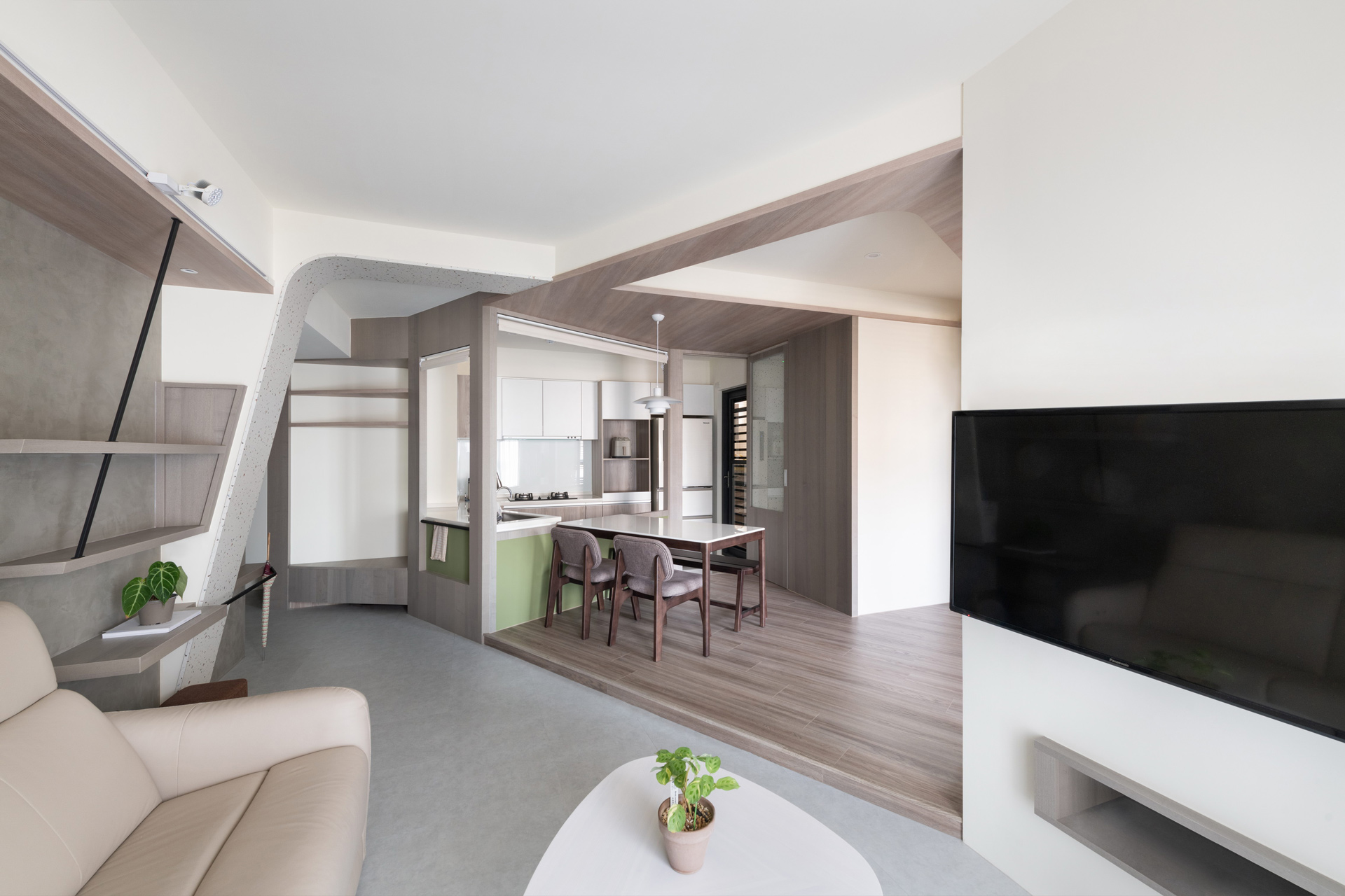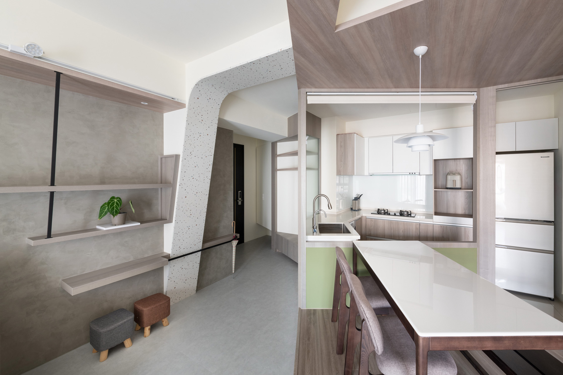 踏入玄關,兩道連續斜切牆面圍塑出的門廳空間,為「家」勾勒出明確的方向指引。在斜切面與結構柱之間的畸零區域置入外出衣帽櫃、穿鞋區等機能,並以木質家具結合對側牆上的全身鏡面,溫潤的居家質感,也讓室內產生放大的視覺效果。門廳後第二道斜向牆面設置可雙向使用的水槽,便於後疫情時代的居家衛生清潔。此一牆面同時順應公共區域的方位轉向,轉向部分為餐廚區域與多功能空間,全區採開放式規劃,並以架木高地板和客廳、玄關做出場域分界,創造流動的空間感受。以玻璃推拉門形式設計的多功能空間則成為公私領域混合的模糊邊界,一方面因應不同的使用狀態彈性調整,也便於孩子長大後的空間需求調整預作準備。