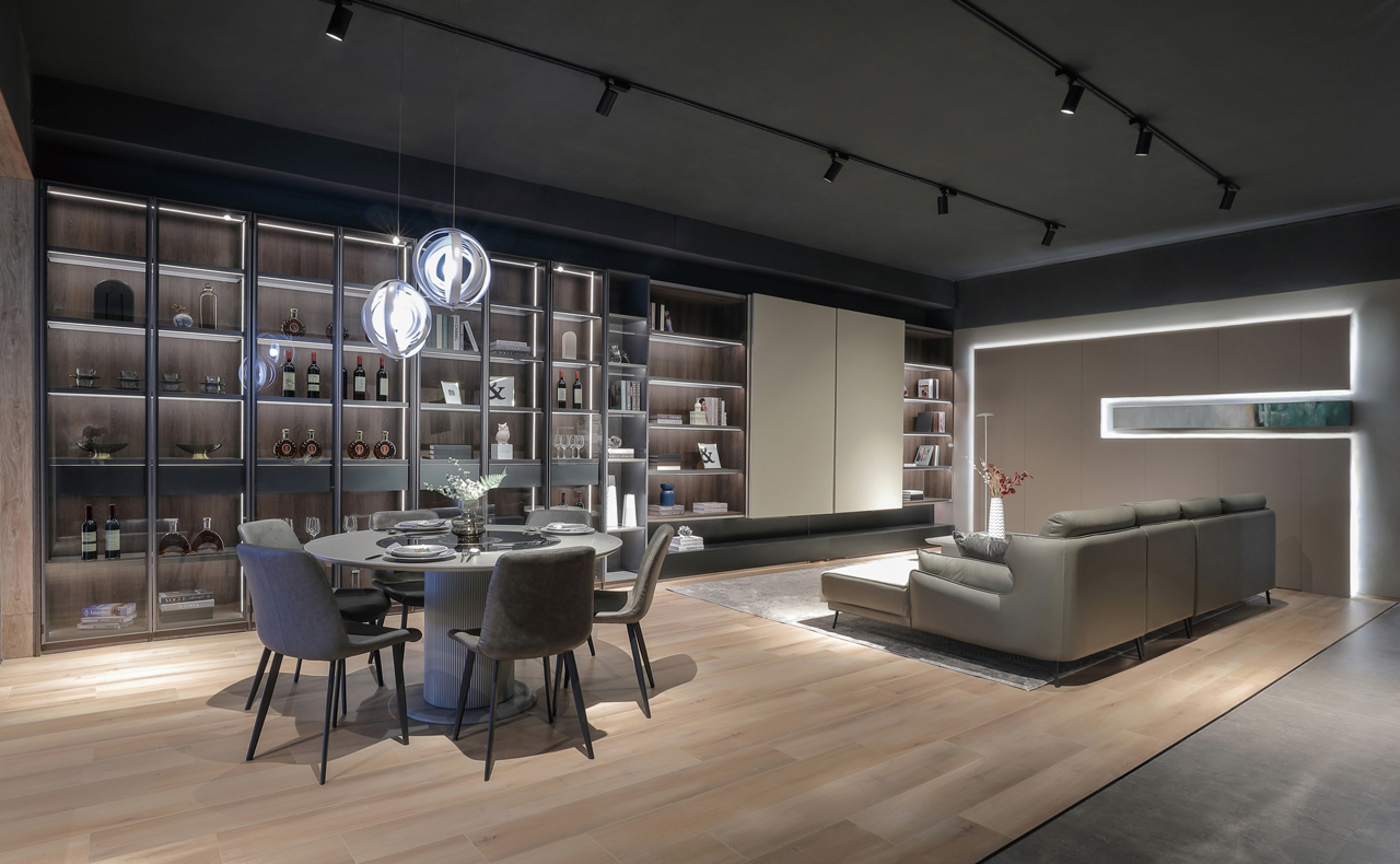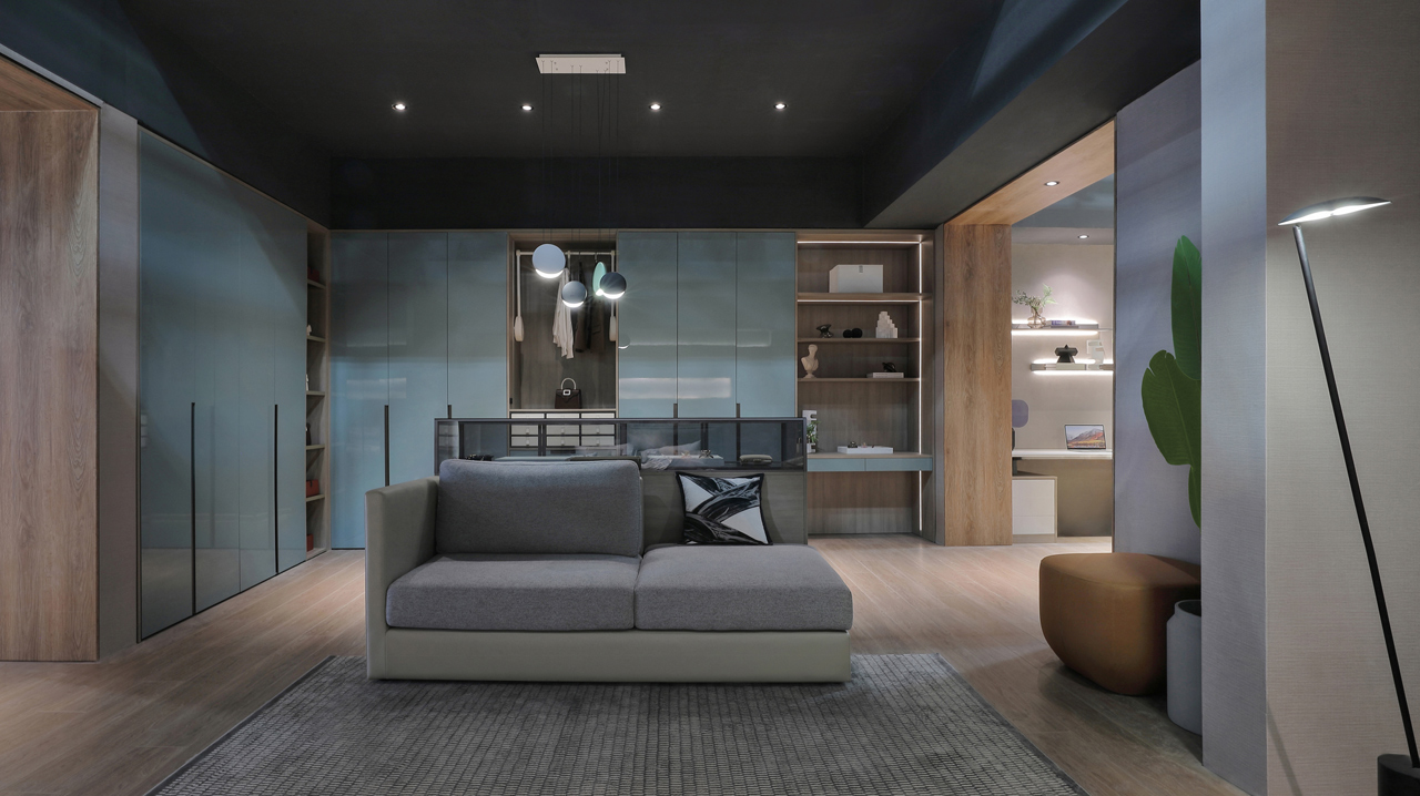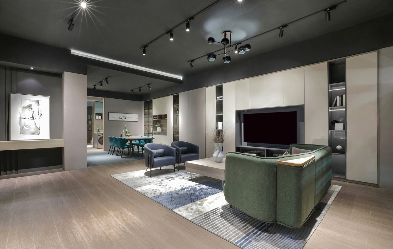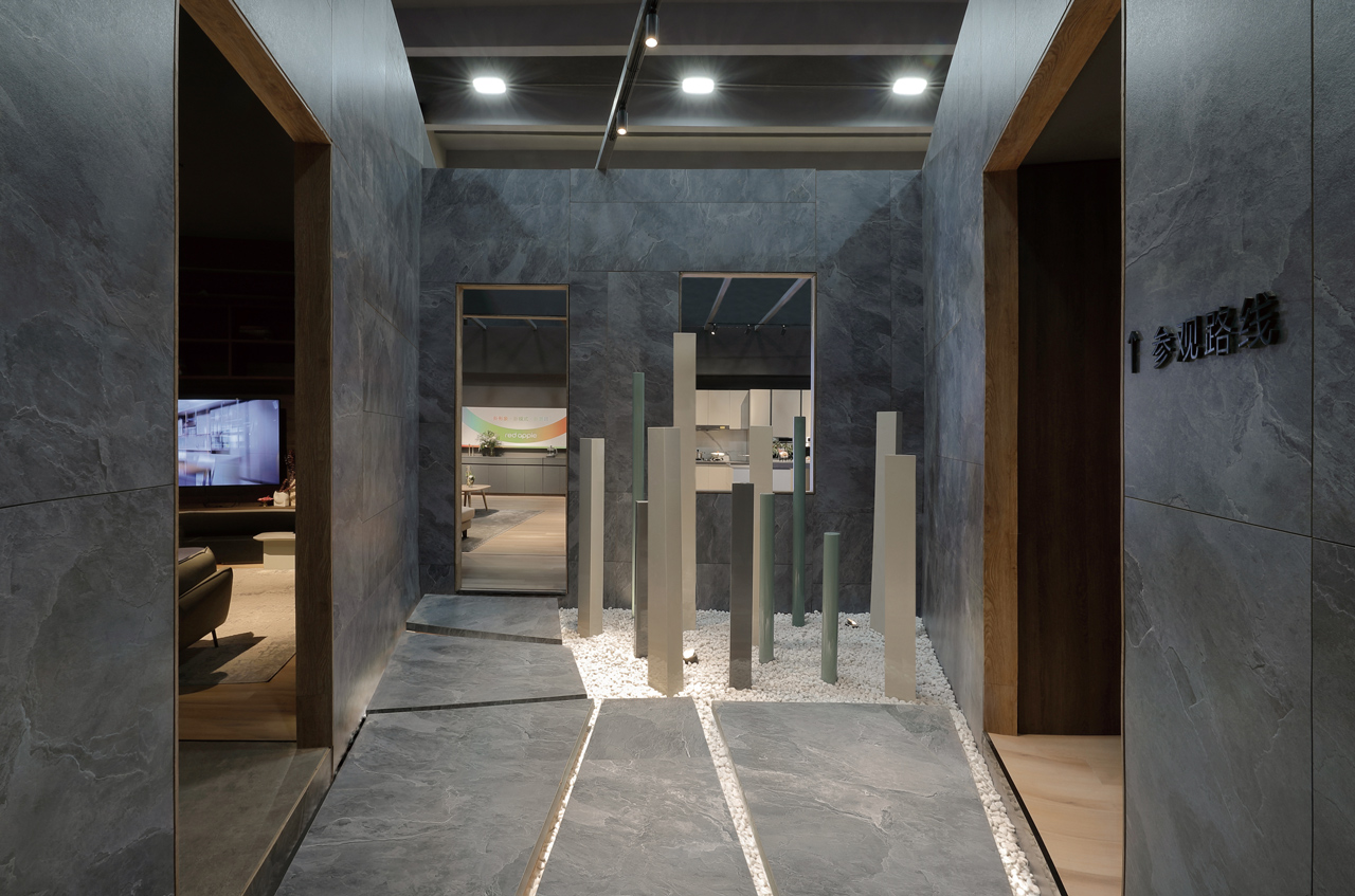 展間內部設計從「家的想像」出發,展現人們對家最基礎、最直觀的印象,在踏入展間的當下一眼就感受到背後的象徵意涵。在平面布局方面,團隊整合隸屬服務性的前台、廣場、洽談區、休閒區、文化走廊,與展示性的客廳、餐廳、廚房、臥室等居家展間,以數個不同空間量體的錯置共構,巧妙地圍塑出一個具有凝聚性的內庭。透過將庭院引入展區核心位置,營造出趣味的生活場景,訪客得以在不同機能場域間穿梭,並透過這個內庭轉換心境,促成新想法、新思維的湧現。這讓庭院成為空間中鏈結真實生活與使用者感知的載體,承載著屬於家族從過去、現在到未來的記憶與情感,進而體現品牌所欲傳達的幸福真意。