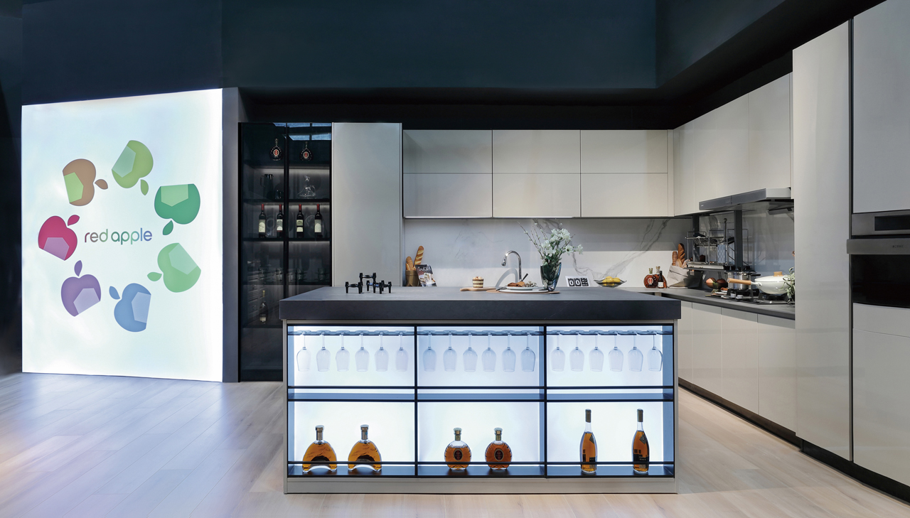 本次廣州建博會,紅蘋果擁有高定館與綜合館兩大展區,兩者形成各自獨立又互有關聯的展示樣態。綜合館主打親民路線,在紅蘋果產品追求品質、設計、人性化等品牌精神下,讓普羅大眾都能用上好家具,同時營造良好的居家氛圍。展區外觀延伸品牌識別標誌於蘋果之下形塑「家」的理念,在方形量體內挖出帶有屋頂山牆的住家形式,就彷彿紅蘋果產品給予使用者溫暖的包覆一般。而這樣的造型結合了品牌主色以活力粉為主的應用,強化年輕、活潑的流行時尚感,令整體展間營造一股輕盈中帶有舒適感的休閒居家感受,進而吸引到訪的年輕族群進入一探究竟,產生連結。