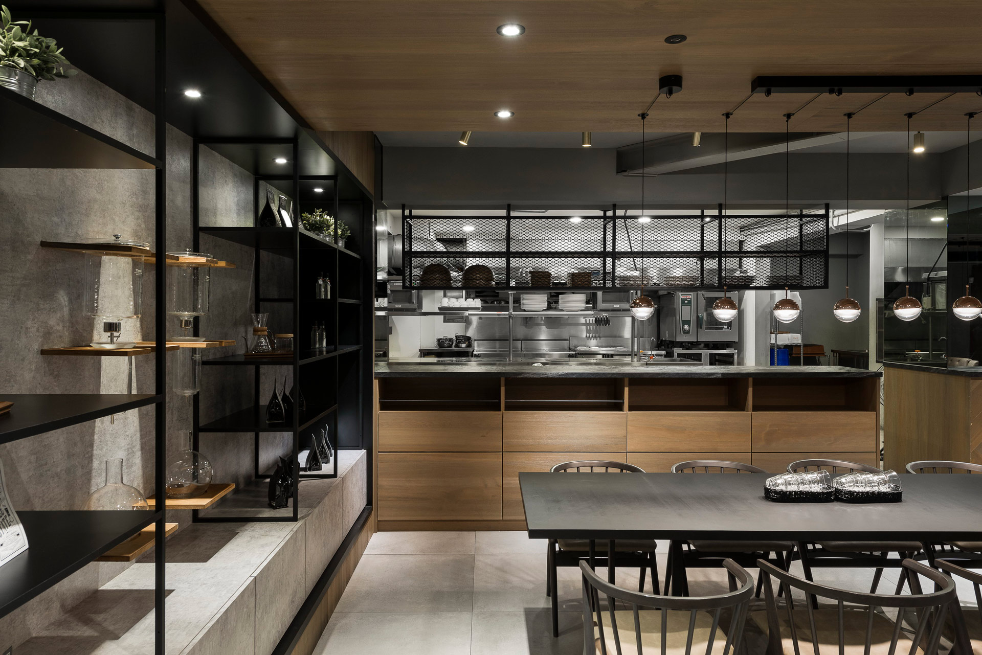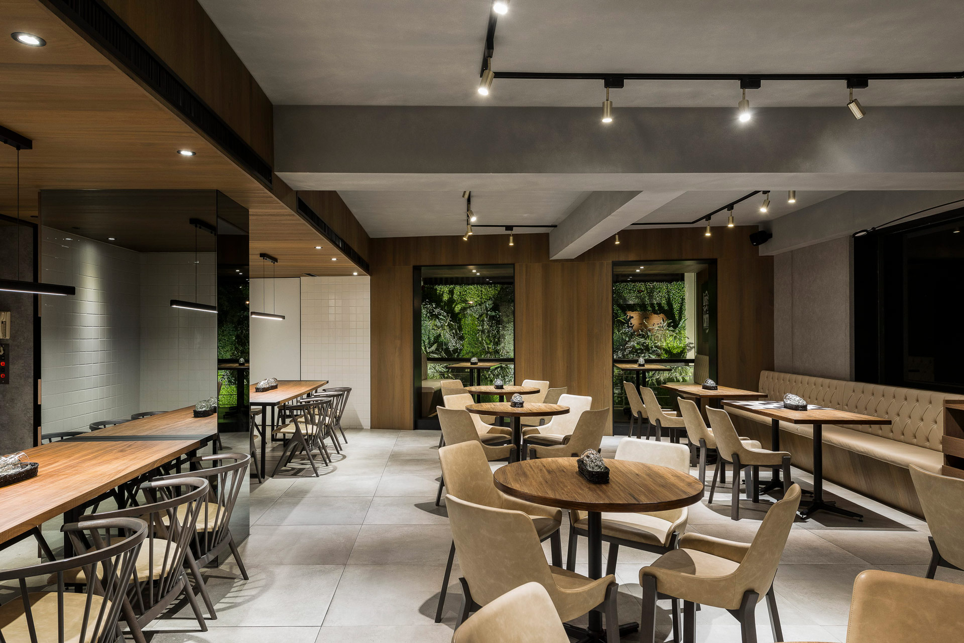 有別於外觀以金屬、玻璃等冷調性材質的搭配,室內空間以大量木料、石材、水泥鋪面與綠植栽等自然系材料,創造原始、溫潤的樸實風貌。二樓藉由植生牆,將既有結構體的開口向外延伸,形成兩間具私密性的包廂,自在安全的氛圍,形塑出適合談天、聚會的場域。用餐空間則以極簡風格的傢具與燈飾,結合梯間金屬網狀的穿透壁面,大面灰鏡與白磚牆的搭配,建構出緩慢、安適的人文生活空間。