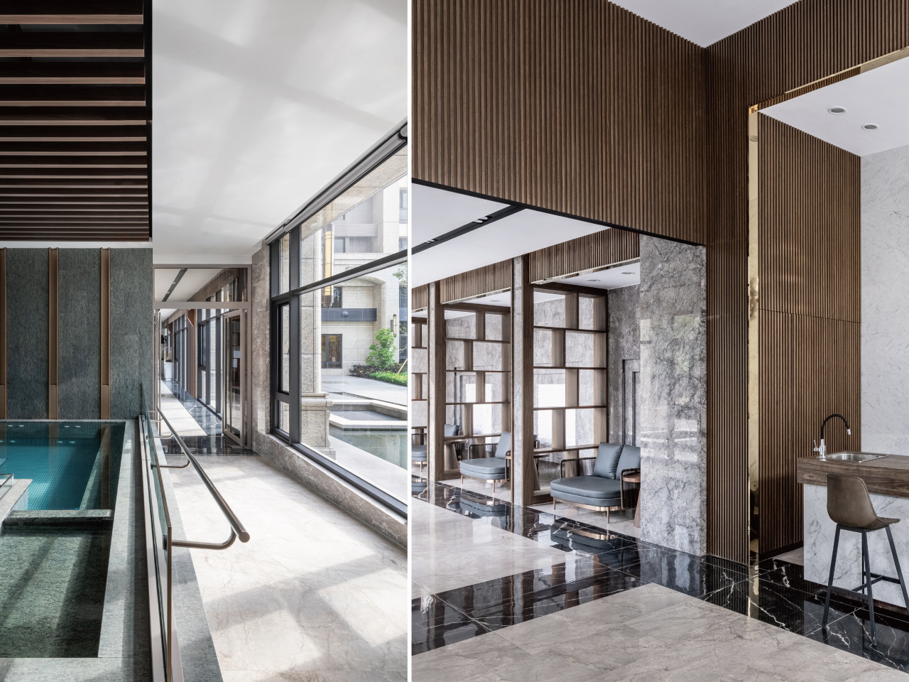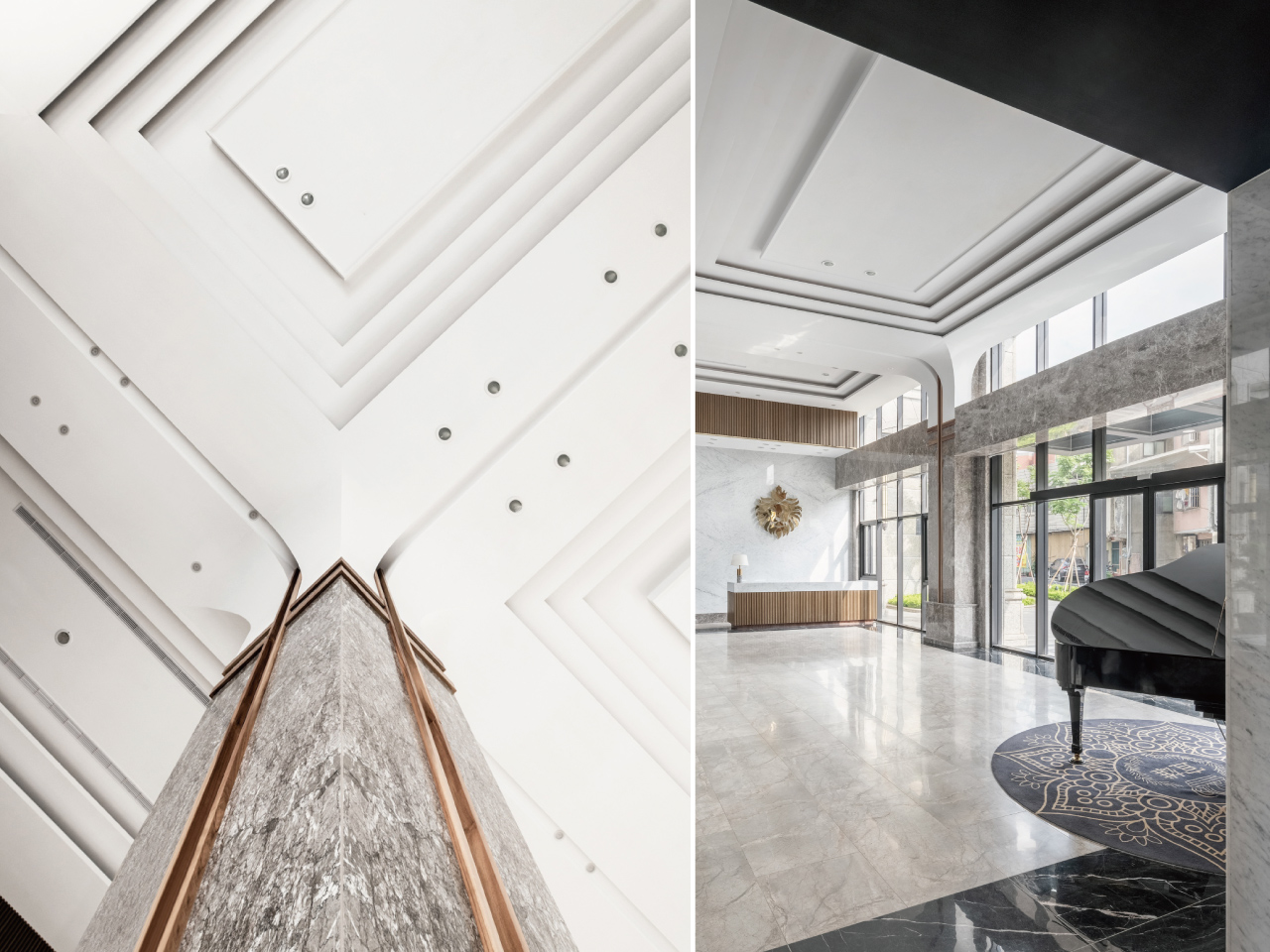 在風格設計上,整體公共空間以簡約、輕質的手法,重新詮釋傳統、細緻的古典語彙空間,過去常見的浮雕天花、線板等裝飾性元素,在輕量化的風格之下,轉而以方、圓、弧線等幾何圖形的層次堆疊呈現,結合空間軸線的對應、具儀式感的比例尺度拿捏並置,將古典元素幾何化。戶外中庭景觀同樣以嚴謹的中軸線為基礎,以對稱的形式與柱列的配置和室內相互對話,形成一個有秩序的空間語言。通過儀式感、尺度感、軸線感的思維重構公共場域,呈現古典的氛圍與寓意,讓設計從過往的繁複中質變,以全新的年輕化形象,再現古典設計的精神。