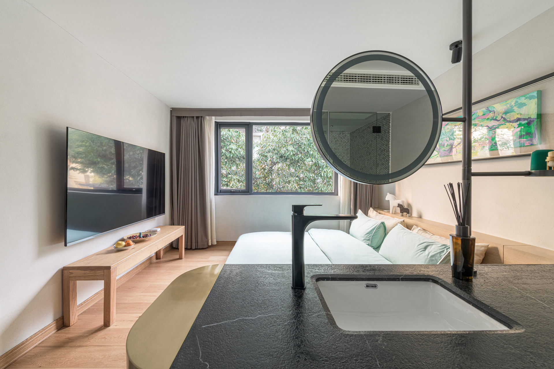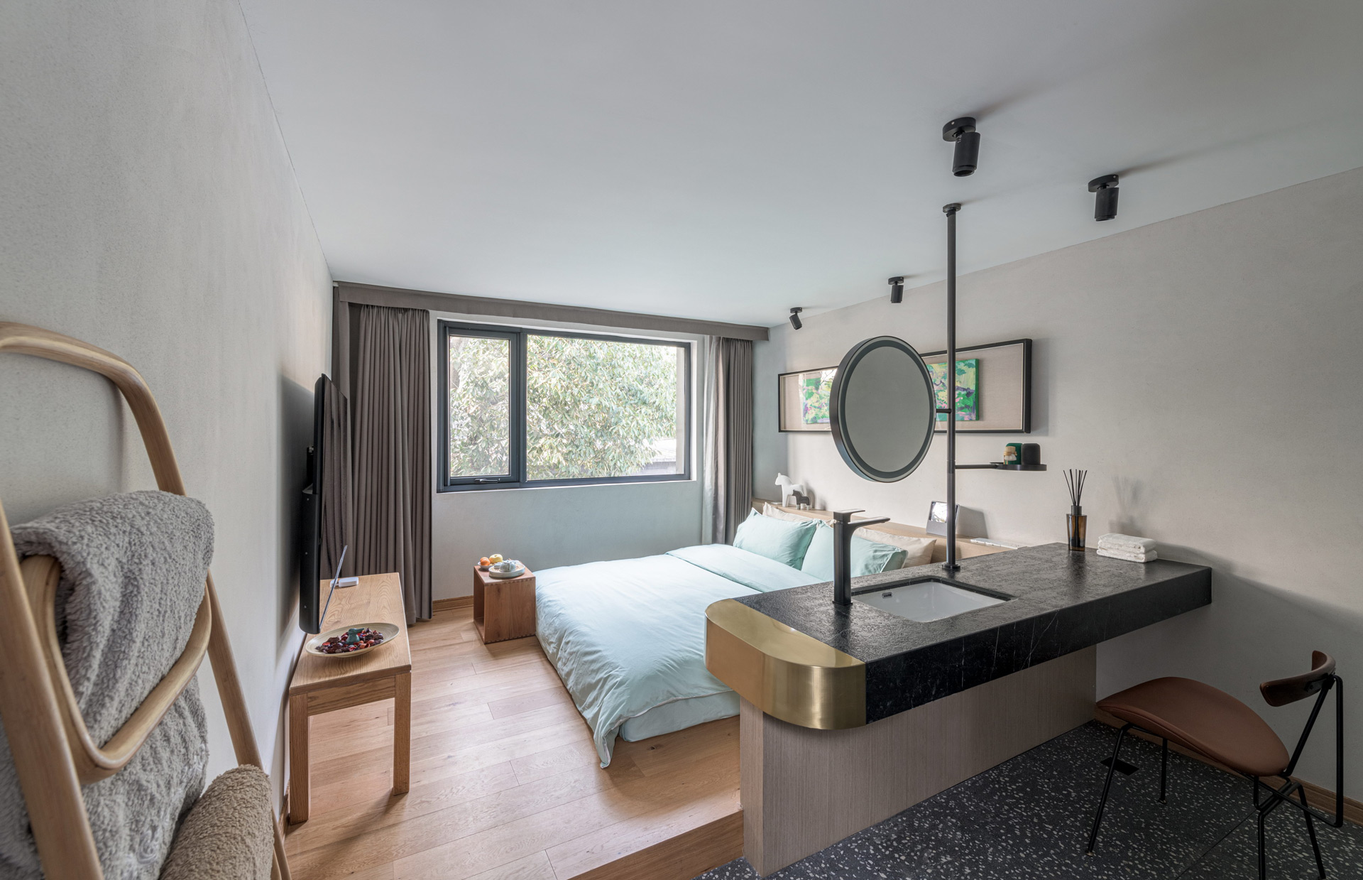In terms of spatial design, “Sanhe Villa” adopts many creative techniques such as the creation of void spaces (e.g., open square and atrium areas), and social platforms (e.g., atelier studio and open kitchen). Regional art events (e.g., painting and calligraphy work exhibitions, book fairs, and local culinary creative shows) were held to bring public attention toward the past, present, and the future of the “Huawaitongwu” village successfully. In order to preserve the inner courtyard of the traditional residences, the design team seeks to maintain the spatial composition of the three remaining suites of the “Sanhe Villa”, and incorporates the specially designed platform domains to optimize interpersonal interactions. The inhabitants can choose to spend time in either a single room or to interact with others in the inner courtyard which include the front and back landscaped areas, the balcony on the second floor, and the black-tiled pitched roof, etc. The embedded platform is designed to connect with the conventional architectural structure in order to create a spatial dialogue. While the design treatment of how the past and the present intersect with each other, it allows the visitors not merely to experience the accommodation (functionality) but to be subject to diverse perceptual experience in the spatial depth and texture.