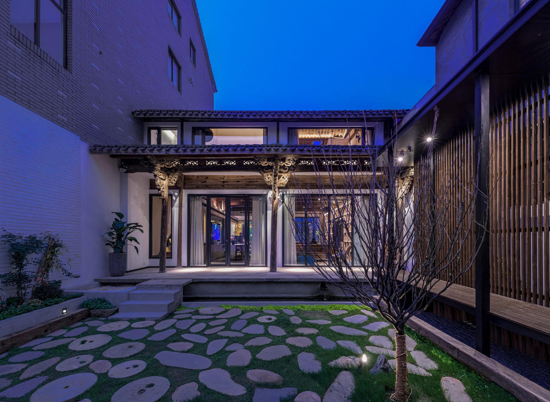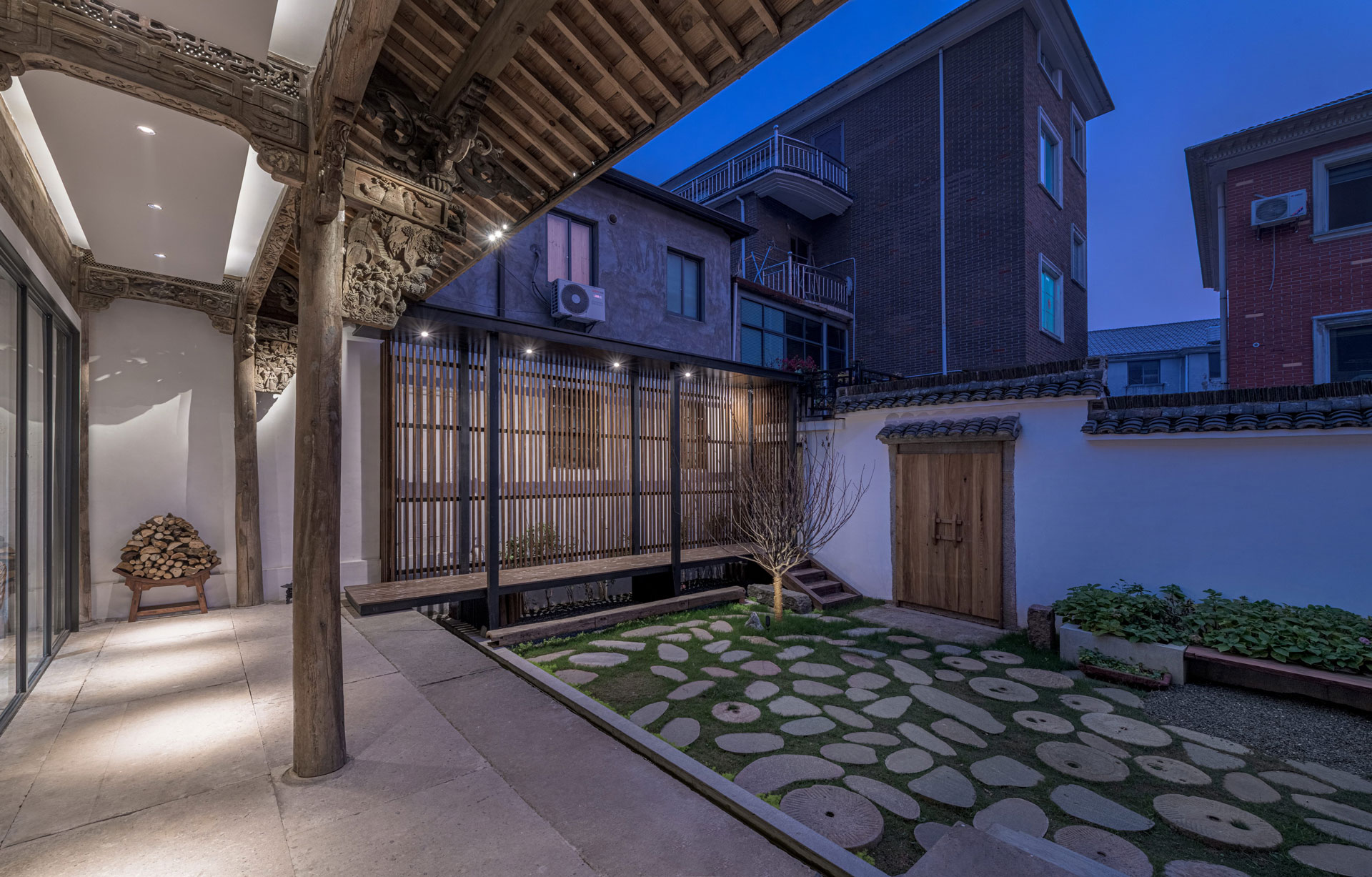 現今「畫外桐塢」內,多數住房建物已改建為現代西化風格的洋房,以符合便利生活與空間使用需求,但這些大量興築的新建築,外型大多缺乏美感品味與文化底蘊,建築與建築間不存在關係的鏈結,令村落舊時的古樸風韻盡失。作為聚落內僅存的老屋,我們以一道大型白色牆面為中介設置於社區中央,以留白、簡約的形式橫亙在新舊建築之間,企圖統一兩者完全迥異的空間場域氛圍。隱身在白牆之後的老屋基地,一方面保留既有結構系統、牆面裝飾與構築型態,同時也植入部分新材料、新工法,藉此保留既有建築形制並傳承古屋風韻。經過改造後的《三禾別院》,現已成為地區重要的文化活動場所,吸引許多產官學者與普羅大眾前往學習參訪,從中獲得啟發,進一步思索文化傳承的重要性。