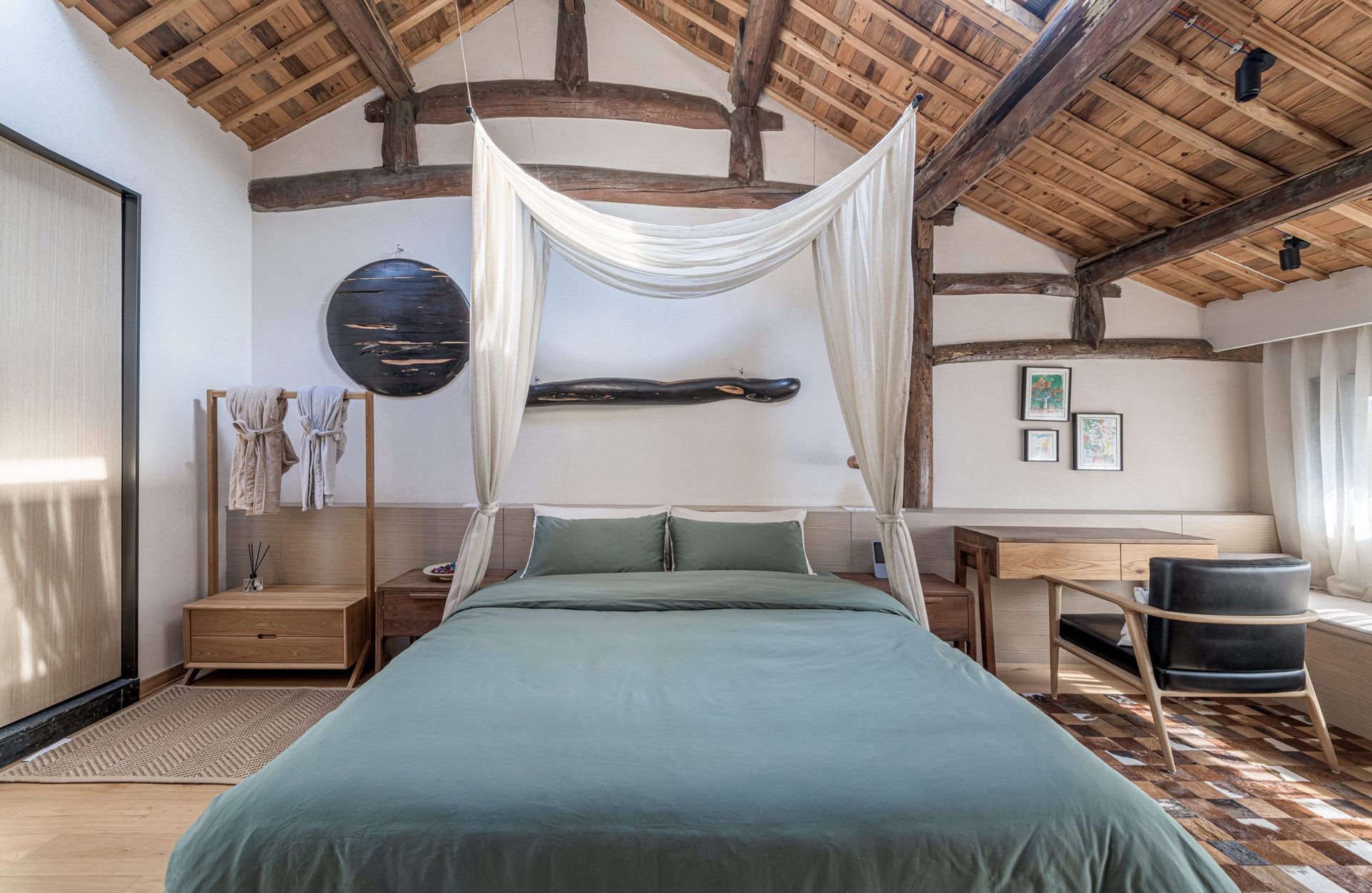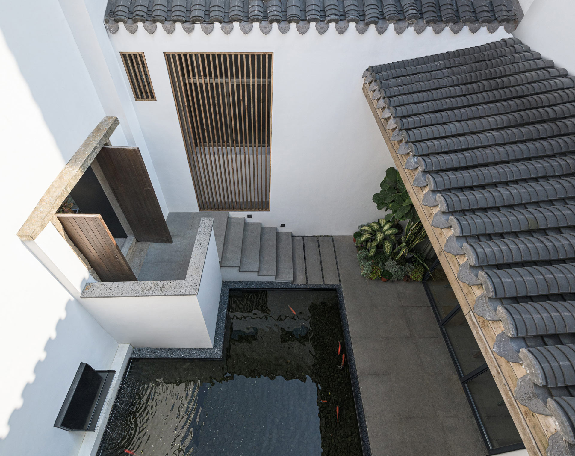 在空間設計上,《三禾別院》採取大量營造虛空間(如廣場和天井空間)與社交平台(如工作坊和開放廚房)的創作手法,並在這些區域舉辦畫展、書展、曬書節、交換在地創意料理等藝文活動,成功引發社會關注「畫外桐塢」村落的過去、現在、未來。為保有傳統民居的合院形制,我們維持《三禾別院》僅有三間套房的空間佈局,結合特別設計的大量平台場域以促進人際互動。使用者可以選擇只使用單一斗室,抑或是在完整的合院內交流,包含花木扶疏的前後院、二樓露台與黑瓦斜屋頂等,平台設計的植入與傳統建築結構碰撞,以多元視角產生空間對話,新舊交接的設計處理手法,讓身處其中的人們不只是功能性的體驗,而以多樣化角度感知空間的深層厚度與紋理脈絡。