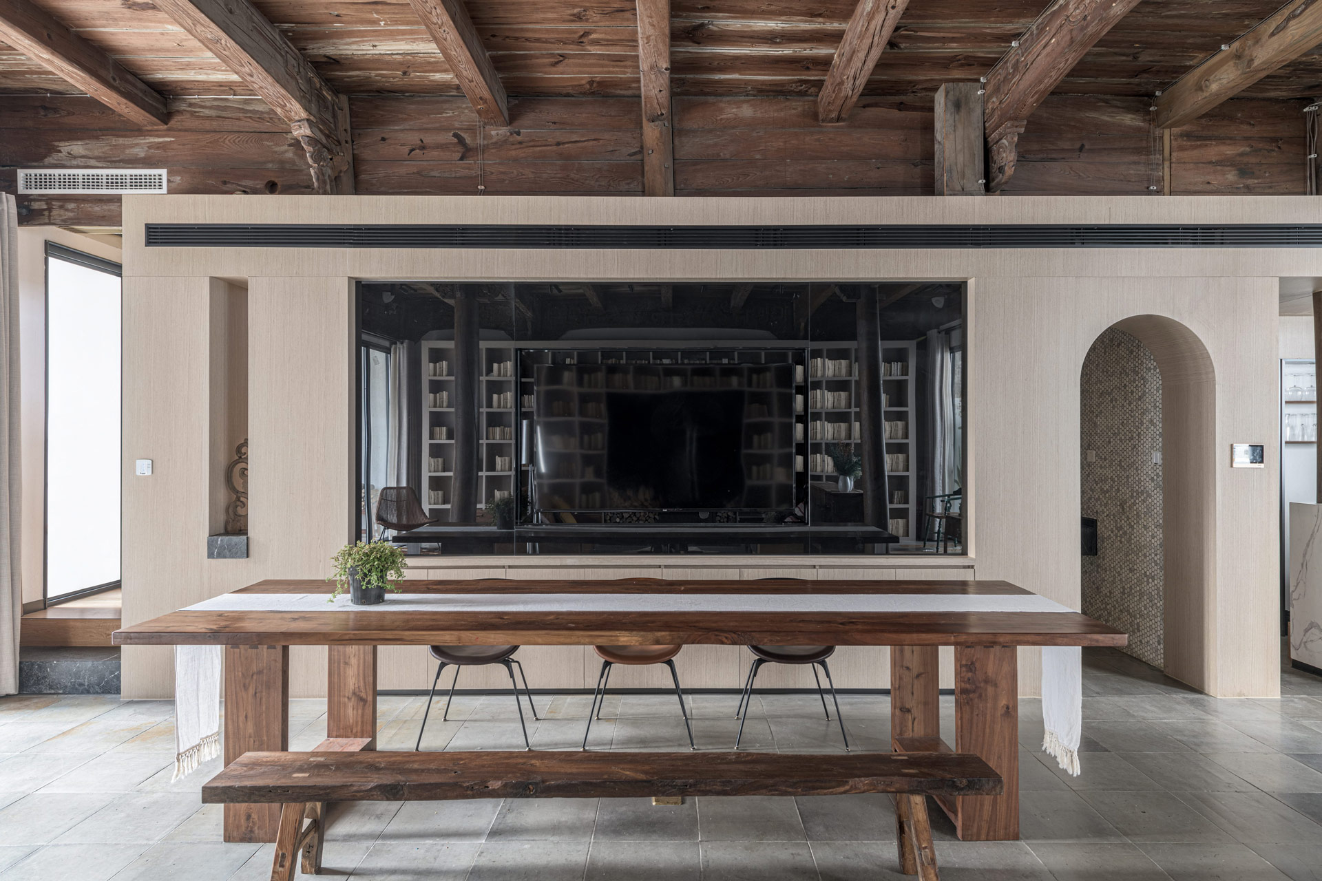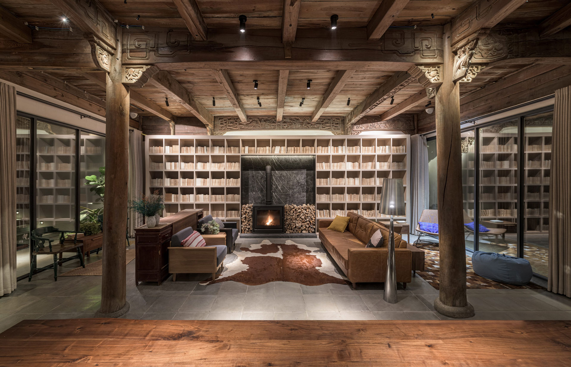 The countryside arts village of “Huawaitongwu,” founded 1300 years ago, is located on the outskirt of Hangzhou City, right next to Xihu. Surrounded by mountains, forests and clouds, it is a poetic place with the richness of the historical and cultural heritage. The site, the 200-year old traditional timber-structured cottage, is a typical southern Chinese architecture style. Three young men accidentally discovered this antiquated cottage and decided to refurbish the originally-to-be-demolished building into the modern housing, as well as to preserve the traditional Chinese joint-connection detailing and extraordinary sculptural elements, in accentuating the much-treasured heritage. With our passion and dedication for traditional architectural culture, the design team decided to purchase the cottage with their own savings, spent 15 years to take the project, and collaborated with three young men’s expertise in brand management, design, and construction; respectively, it takes enormous efforts to preserve the decayed remnant by converting it into the base of community culture exchange for gathering backpackers, influences, and neighbors. “Sanhe Villa,” a regenerated architectural work was stemmed from cross-discipline collaboration.