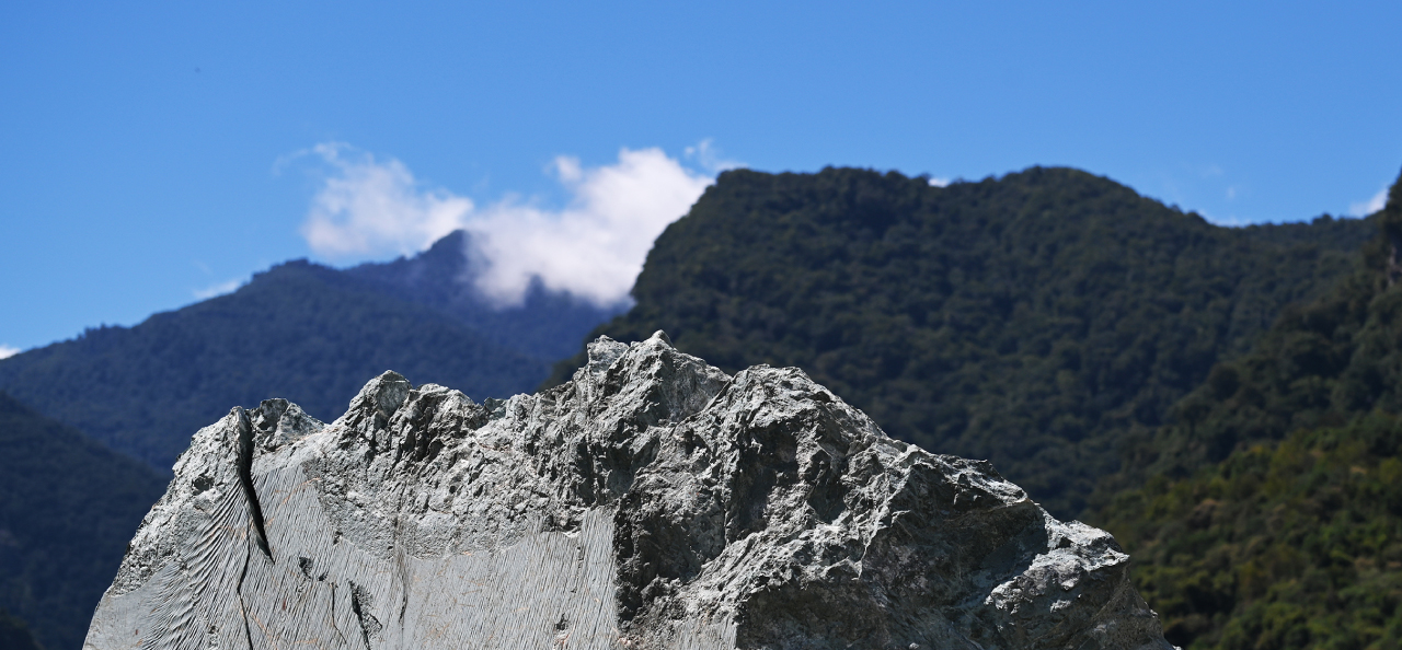 蘊藏於山脈下千形萬態的岩石樣貌,是由橄欖礦石變質、飽含多種礦物成份所產生的蛇紋石。其外觀呈現透亮的翠綠彩度與自然有機紋理,是具備多孔特性及氫氣自由基的鹼性礦物石材,早在文藝復興時期就廣為運用在建築與雕刻中。台灣玉紋石產自中央山脈以東的花蓮山區,此區域歷經千萬年來的板塊碰撞及高溫質變,形成具有高含玉量、高強度、高硬度的綿長蛇紋岩脈,並在1970年代開始有系統地進行的大規模開採,數十年來逐漸發展成一股引領台灣石材工業的重要力量。