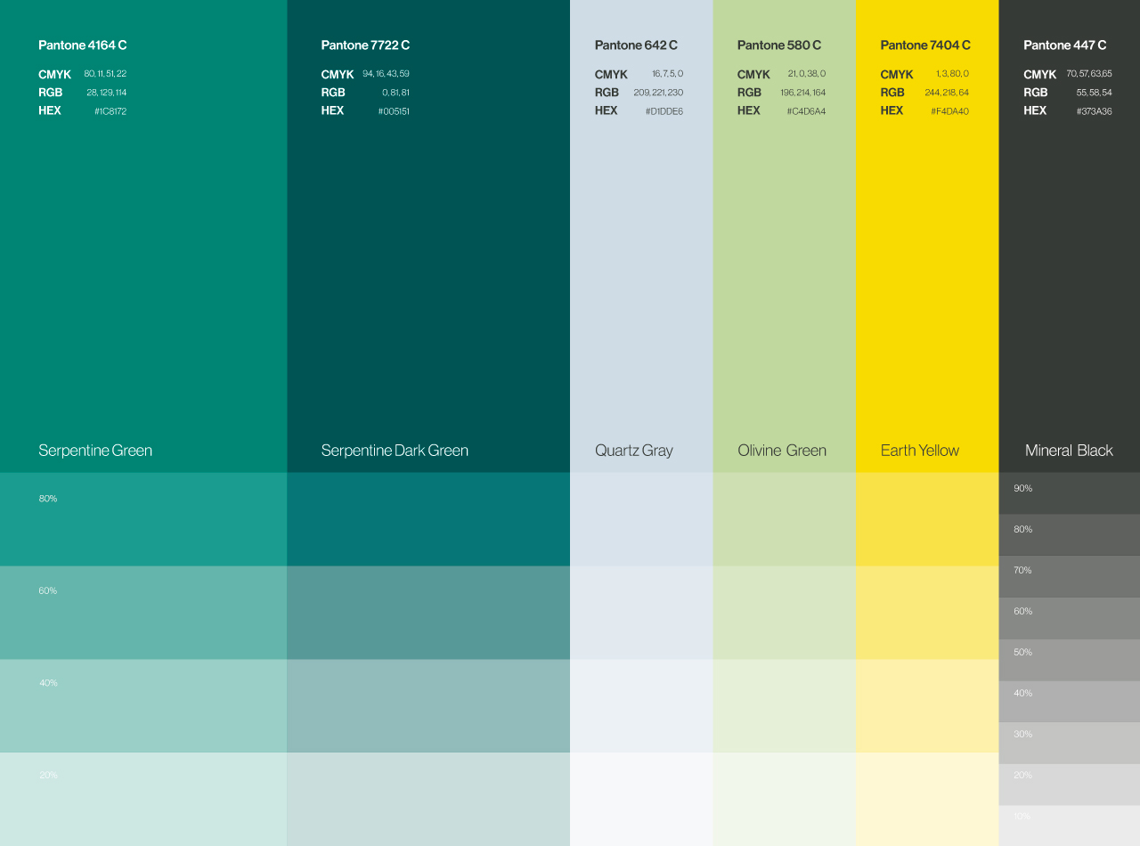 色彩擷取自三泰礦業獨特的玉(蛇)紋岩,以藍、綠交疊混合的蛇紋綠為主調,與輔色交互搭配,體現既穩重、泰然,又求變、多元的品牌視覺樣貌。
