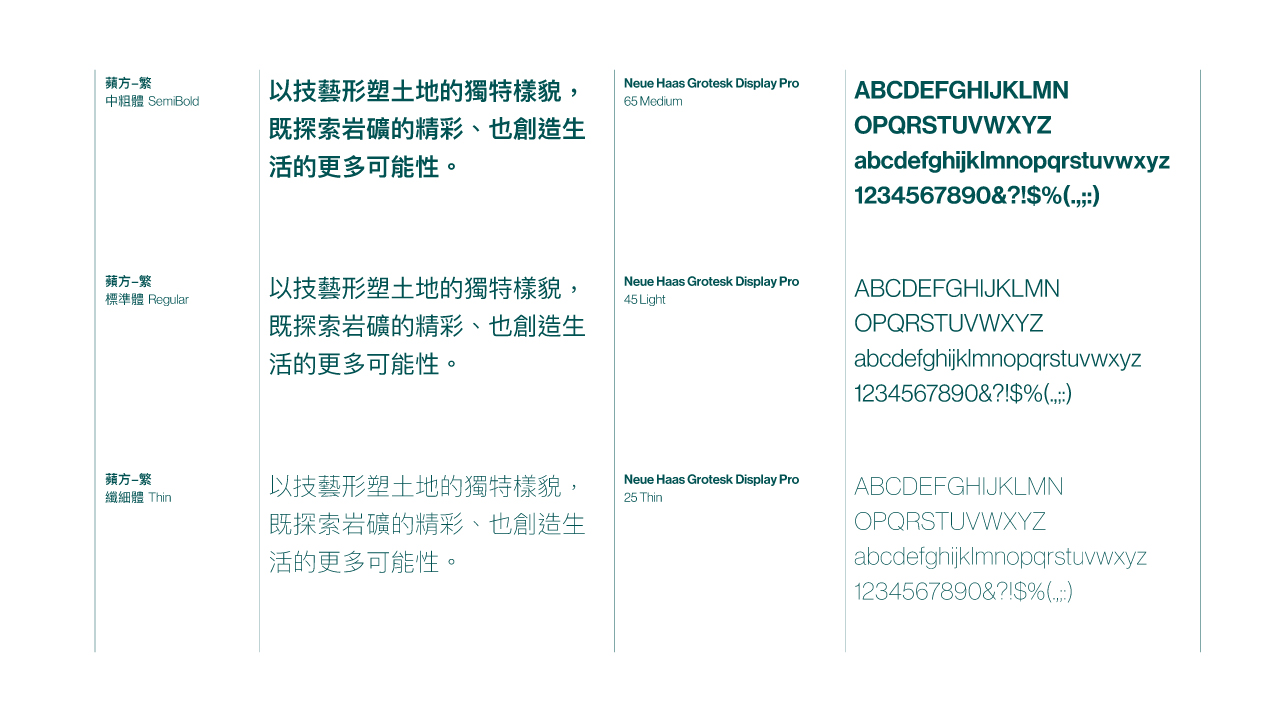 設計靈感出自於大理石礦場的岩石立面,藉由色塊與線條(縱向、斜向)的排列,模擬開採切割時所留下的痕跡意象。圖標文字的粗細對比應用打破以往岩石厚重的既定印象,不僅回應「由重到輕」的漸變關係,更成功詮釋年輕、勇於求新求變的品牌性格。