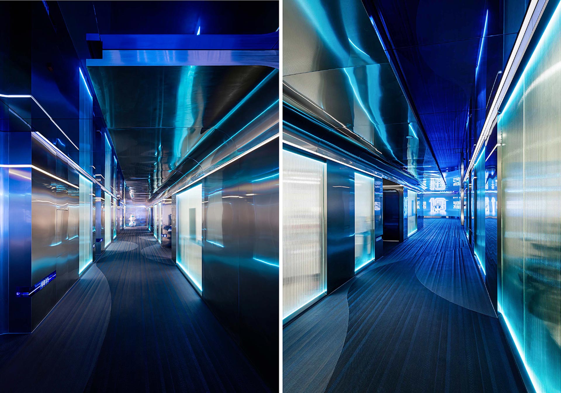 室內藉由大量銀色霧面金屬板、長虹玻璃等異材質搭接,創造空間中的科幻感,而以「藍色」定調的展示空間,延續了三維家強調數位應用與高科技的品牌精神,也象徵資訊與知識的延展,反映出知識如大海般遼闊的意境。藍色本身自帶著靈性氛圍,其冷靜、沉穩的風格調性,也和以科技、人文出發,主打軟體介面操作,著重教育性與平台推廣的品牌理念相吻合。展區內以圓弧造型設計的入口大廳,開放式的規劃,除了可作為品牌未來舉辦發佈會、線下產品講座、線上直播等不同活動的多元彈性運用,也促使展示空間成為品牌資訊傳達的核心場所,凸顯其強調數位體驗的品牌價值形象。