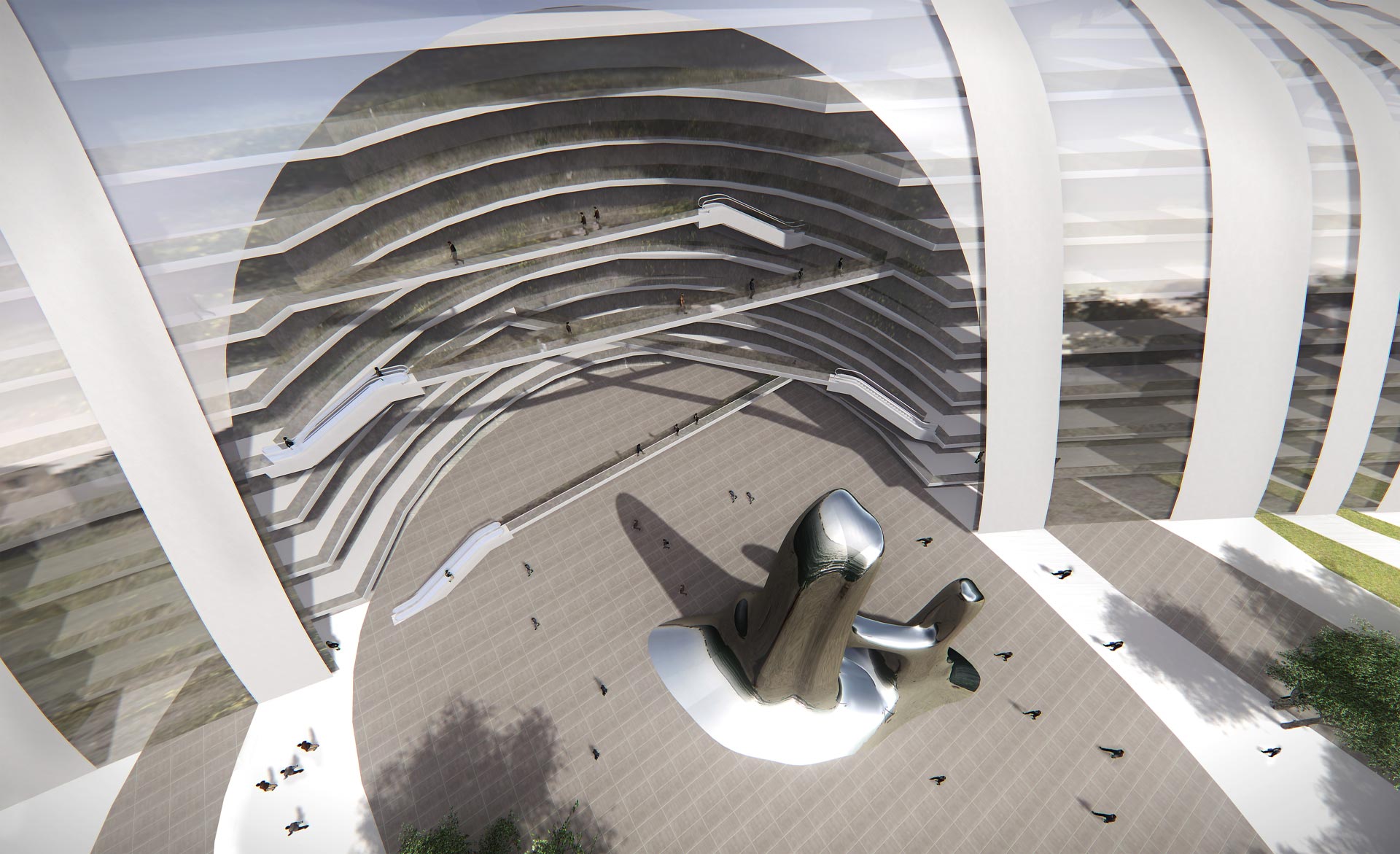 設計上我們將東方山水的意境透過西方的數位技術和手法重新融合表現出來,企圖把單純的建築群轉換為多層次的城市複合體,透過樓板參數化錯動的手法,創造多出面向的空間漫遊經驗來產生各種可能的事件(event),企圖強調內部與外部連結之中介空間,有效導入自然創造出獨特的微環境,讓光線和風在空間中竄流,弱化了建築中的邊界感,讓空間的形體消失在空氣、風和光線的流動中,創造許多的給予人們停留的空間,創造出更好的空間品質及工作環境。