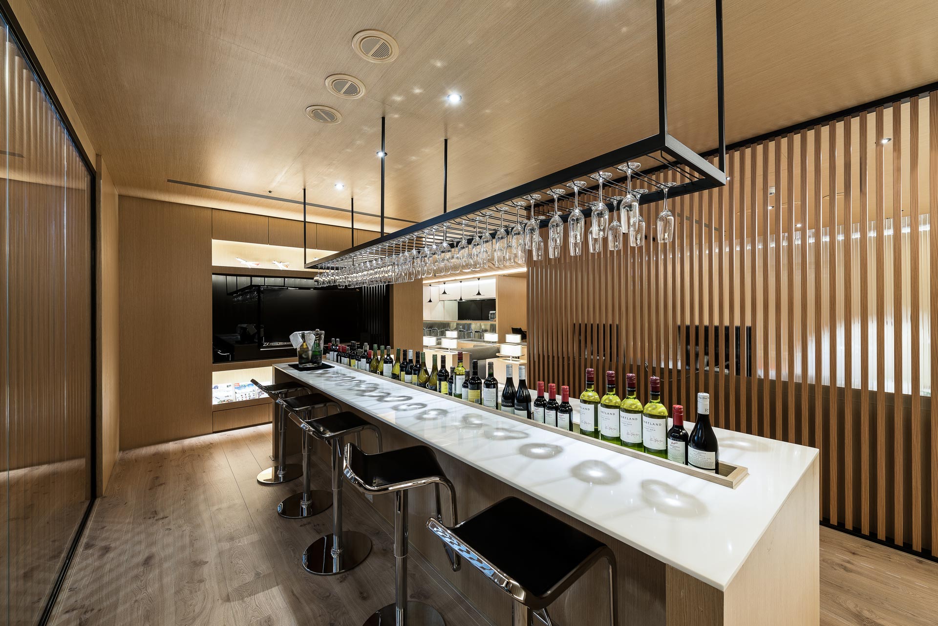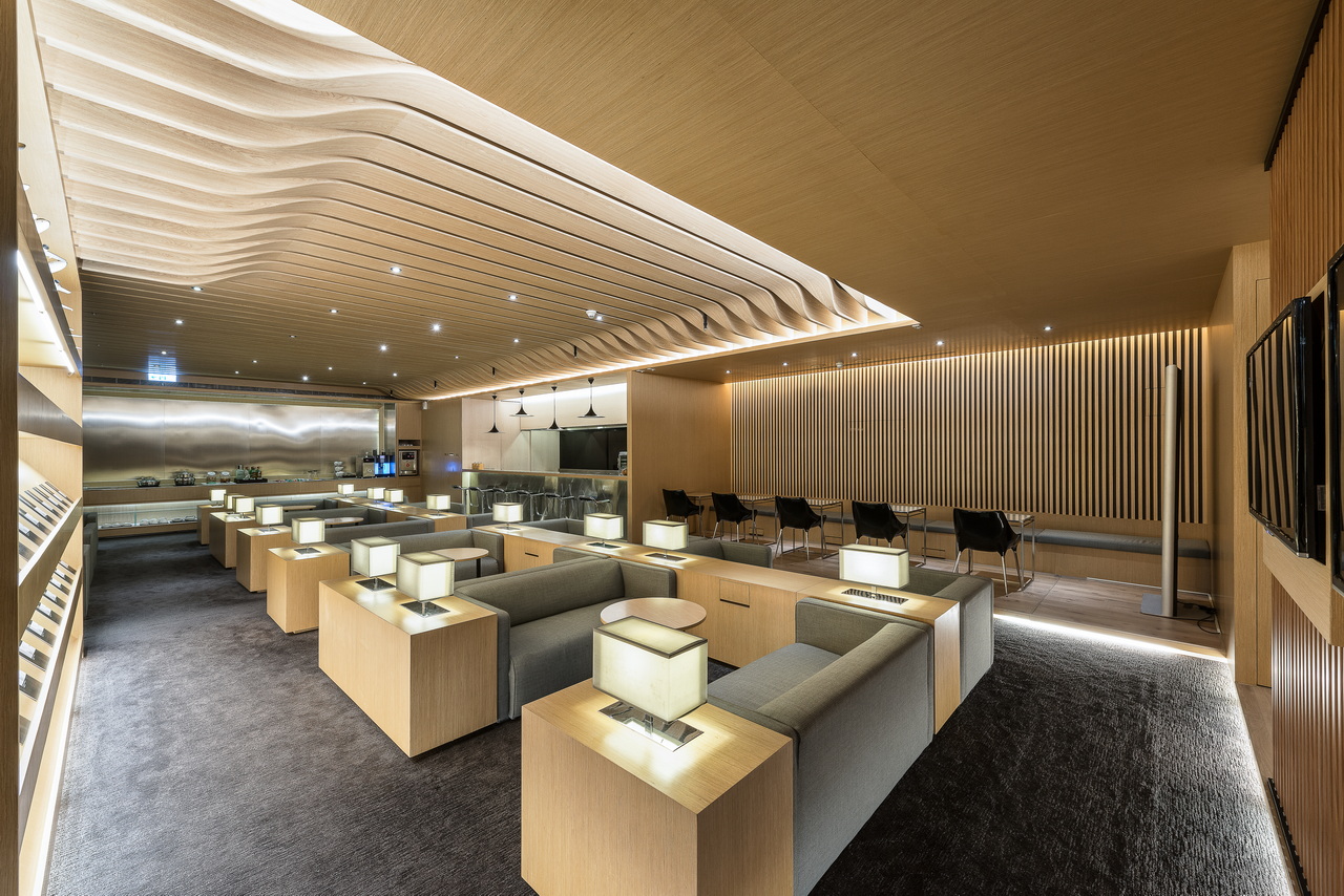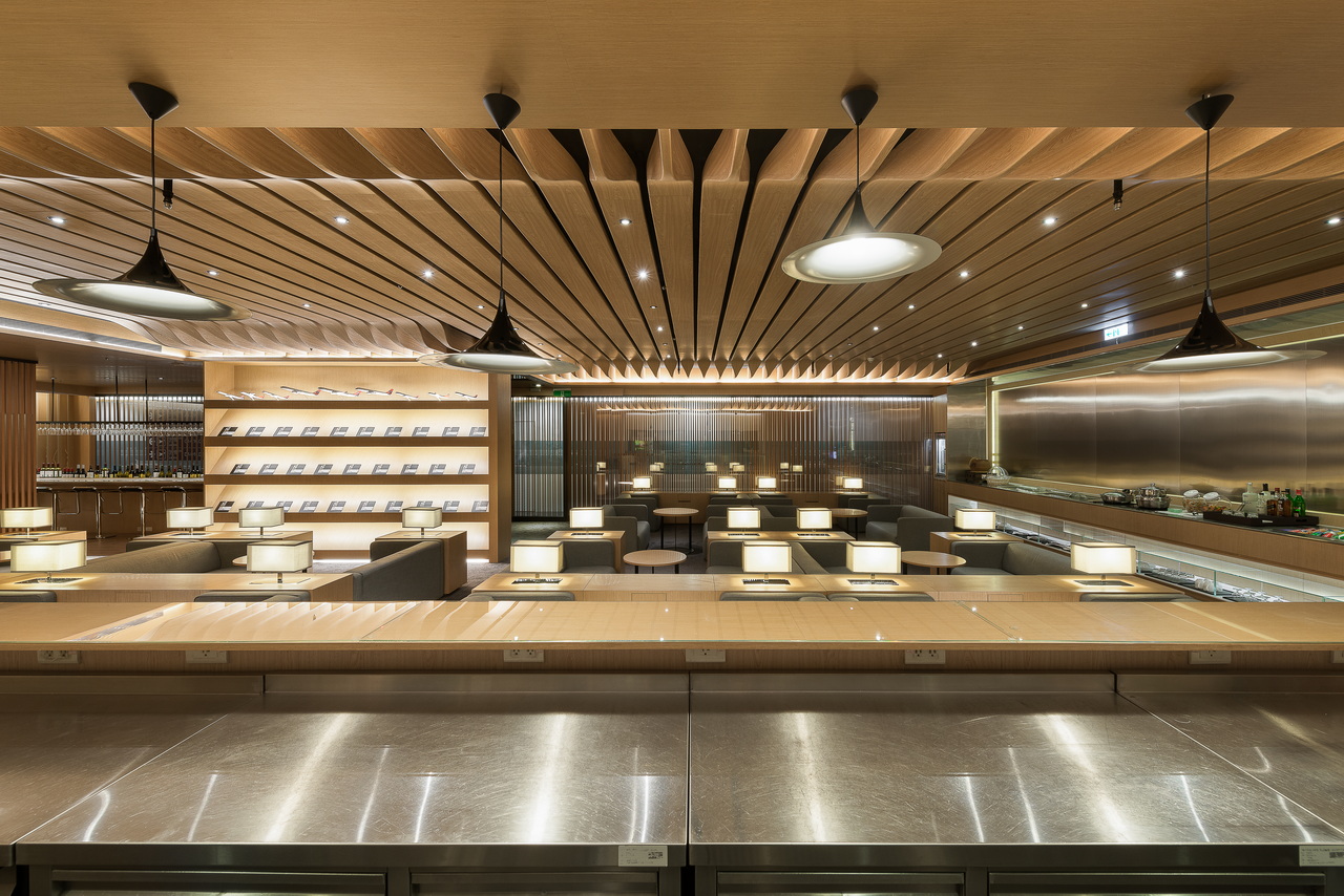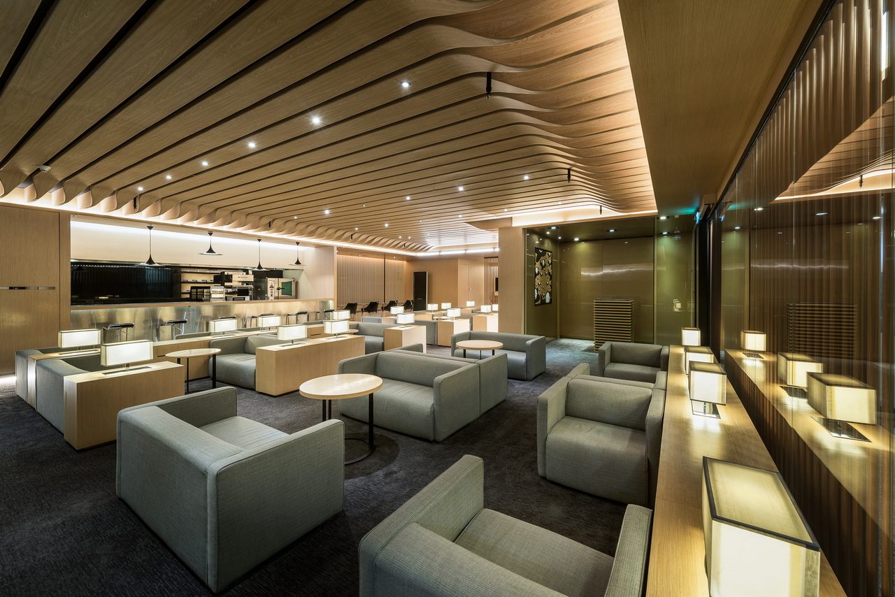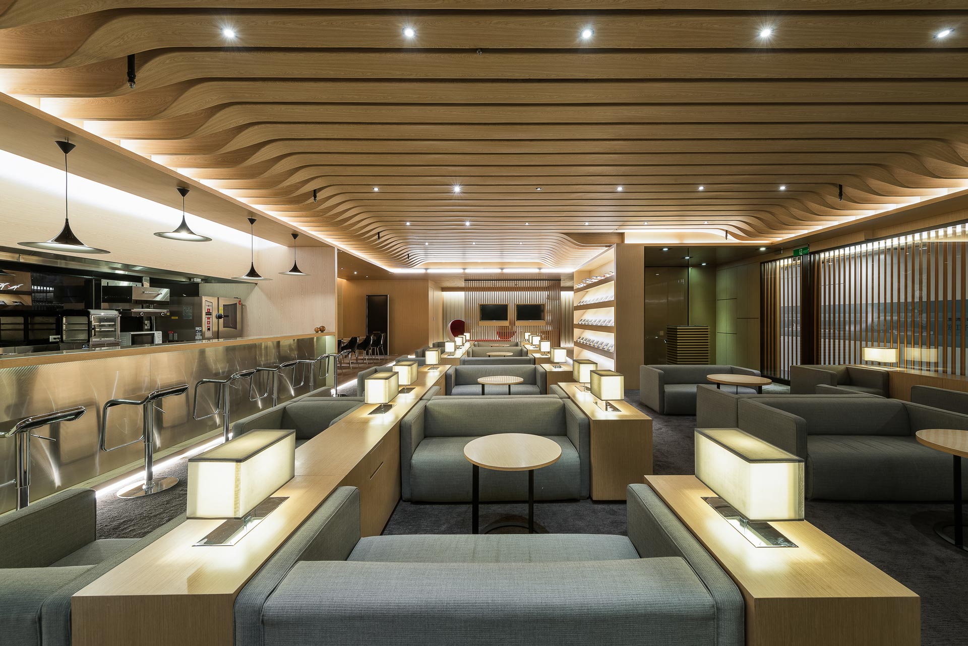 因此,設計團隊置入了一道「曖昧介質」,有如中國水墨畫裡常見的竹林場景,亦即古典詩歌所謂「獨坐幽篁裡」的「篁」之意象,將貴賓室對外的牆體解構成為由4層錯落管柱所共構成的介面,彷彿是在航廈裡長廊裡展開一扇大屏風,藉由管柱的排列角度與密度計算,讓遊客從外無法一眼看透內部空間,但在行走過程的幾個特定角度卻又能隱約透見其中人影穿梭流動的朦朧美,在保有私密性的基礎上創造了曖昧質感。