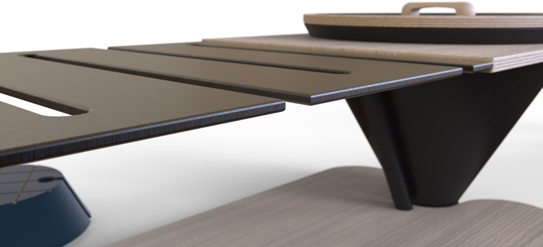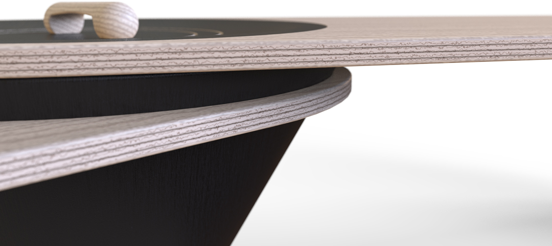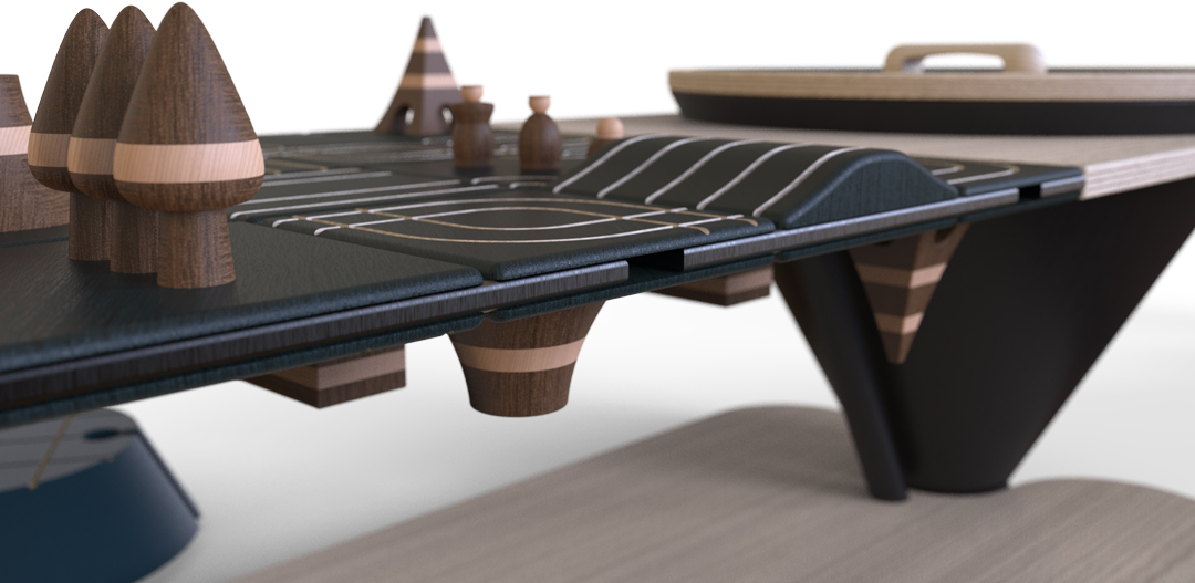 兒童家具猶如一座孩子的城堡,創造童心的小小天地,若依孩子們的想像,一張親子茶几應該會是什麼模樣呢?以此為發想,在外觀設計便打破成人世界對桌子的定義,以電影《全面啟動》(Inception)中的夢境城市為靈感,在一樣的時空下存在多個平行世界,投射在設計上,茶几桌面被拆分為成人與兒童兩個部分,再以中央倒圓錐體為軸心串起,如同兩個各司其職的運行系統,以此引領出新家庭生活的夢幻角落。在兒童遊玩範圍內,盡可能依循孩子觀點規劃,創造上下顛倒世界的主題,內外層桌面皆以不同的玩味觀點與孩子鏈結,最終構築成能滿足學習、創作、應用三個不同成長階段,連接兒童由「孩子氣」至「玩味」的思想情境。藉由跨越物理侷限留下不同體驗與思維,引導孩子與父母隨自由設定的遊戲方向一步步連結,同時在不同的觀點與經驗背景下,逐步找回屬於自己的「童心」,構成一個可以增進「未來小智人」與「未來超智人」共同對話、交流的家居空間。