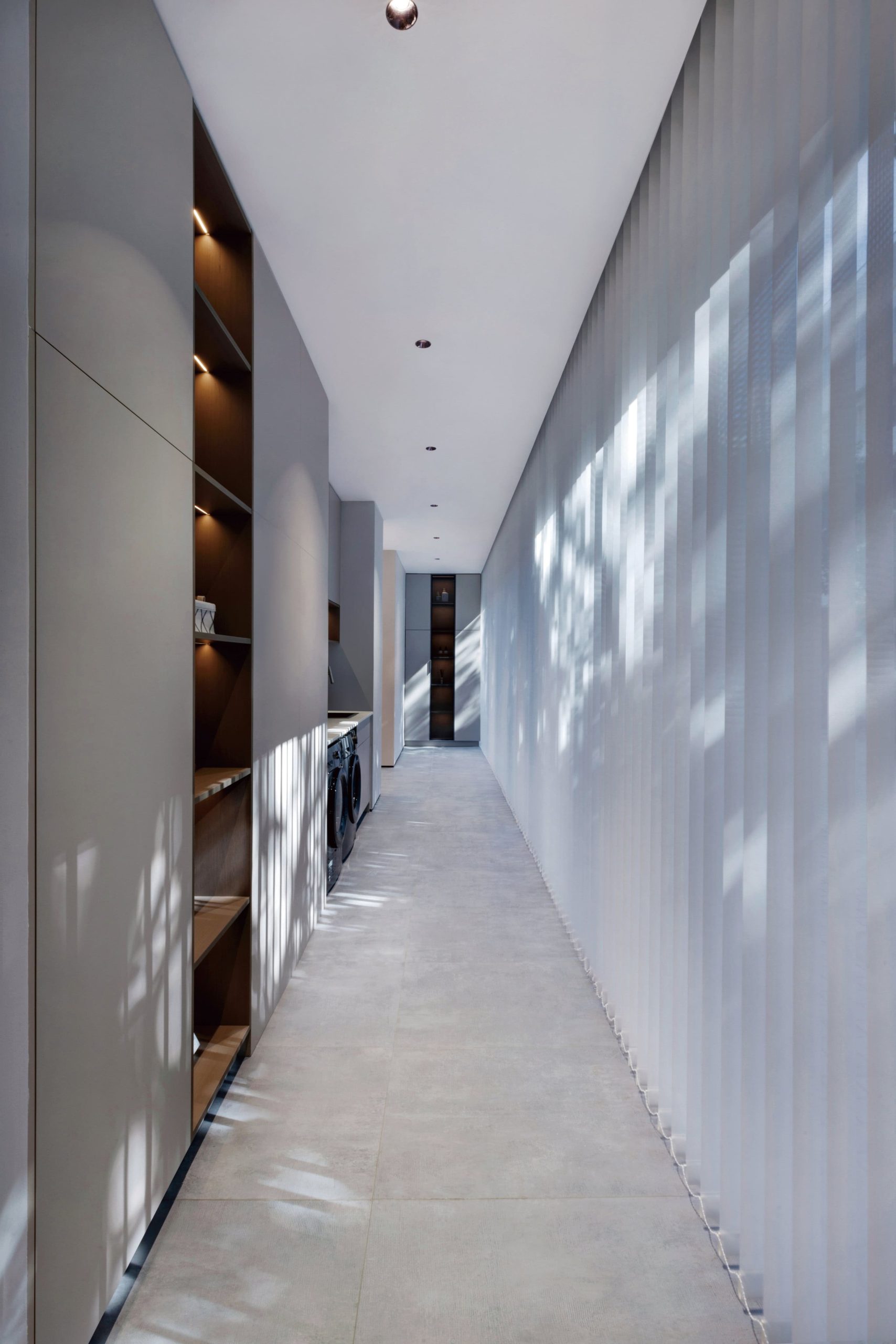 呈現狹長矩形的展廳基地內,一側臨城市主幹道,另一側毗鄰生產區,擁有通透的玻璃幕牆與良好採光,卻也面臨室內大量結構柱體的干擾,於是優化展間的空間體驗成為設計一大挑戰。在入口處以內縮的退讓空間,形成醒目的玄關小廣場,藉由「以退為進」的手法化讓展間大門化身為城市客廳,並自然過渡建築內外。立面以金屬網材質建立門頭,強化品牌識別性與高度。室內巧妙地善用既有柱廊,以具序列感的空間元素,形塑迂迴而富層次的參觀路徑。入內後,參訪者沿著遊逛動線依序穿越尚品生活館、時尚整家館、融合店與拎包社區店四大展區,每區皆以不同風格、尺度與情境鋪排,展現品牌對生活多樣性的詮釋。空間節奏透過視覺長廊貫穿全室,讓觀者在前進與轉折之間,與產品產生深度互動。